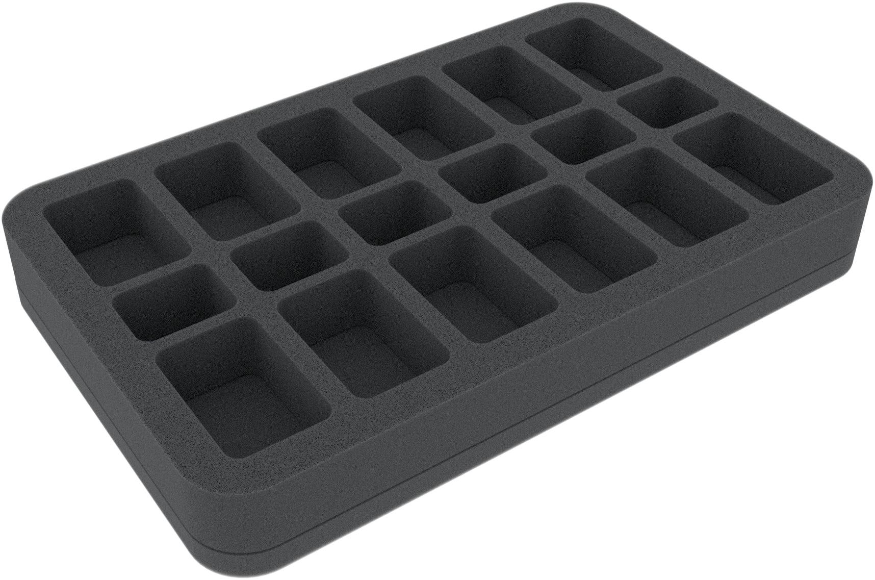 This Half-Size foam tray is divided into 18 compartments of two different sizes. Ideally suited for miniatures with round or square bases up to 25 mm.