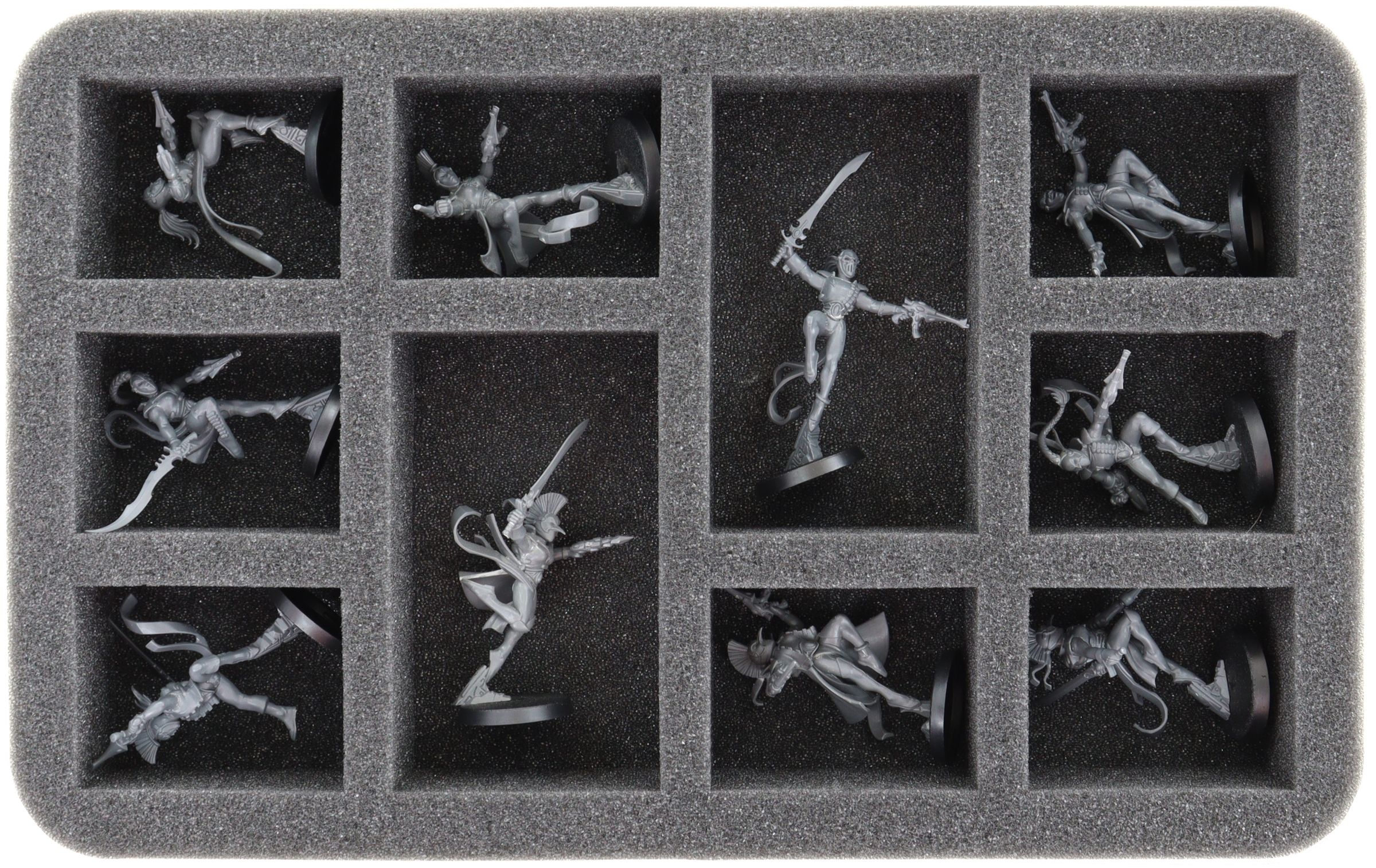 This Feldherr foam tray provides space for up to 10 miniatures of your army. The insert is particularly suitable for storing bulky miniatures like Shadowseer, Death Jester, Solitaire, Harlequin Troupe, and miniatures with similar dimensions.