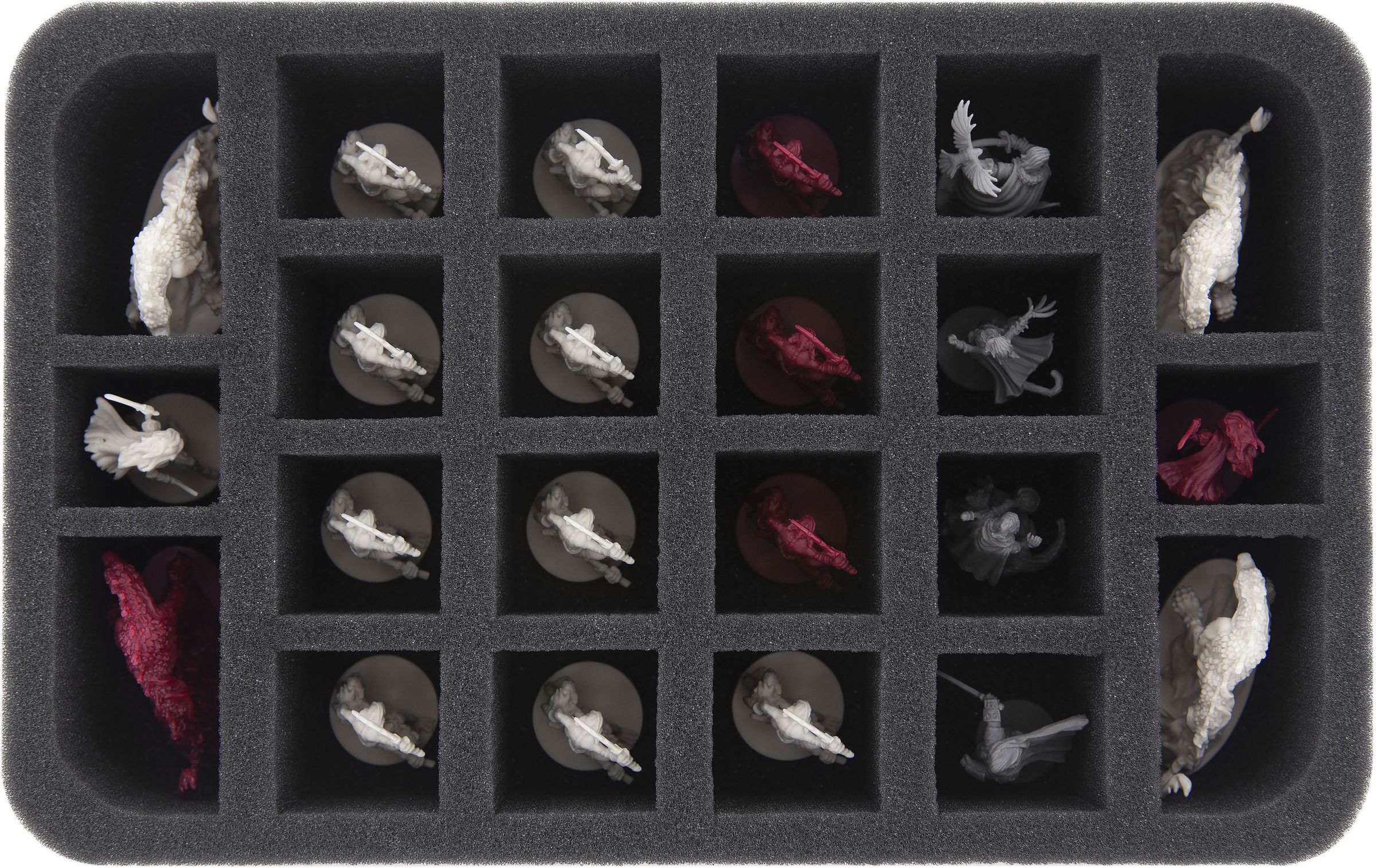 All figures of the expansion can be stored in 22 compartments tailored to them, clearly arranged and softly padded. The four large compartments, with rounded corners, offer space for the Hellhounds. Your heroes Lyssa, Ronan of the Wild, Vyrah the Falconer and Challara can be distributed, along with the goblins and deep elves, into the other compartments. The miniature-precise cutting prevents the miniatures from slipping and colliding during transport. This protects the painted figures from flaking off. Details, such as Vyrah's Falcon, are also spared from storage or transport damage.