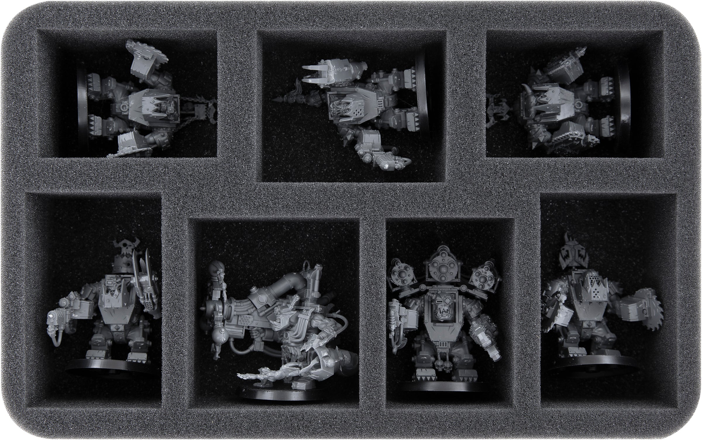 On this Feldherr foam tray you have space for up to 7 miniatures of your Warhammer 40.000. The insert is especially suitable for storing the Meganobz, Big Mek with Snotzogga and models with similar dimensions.