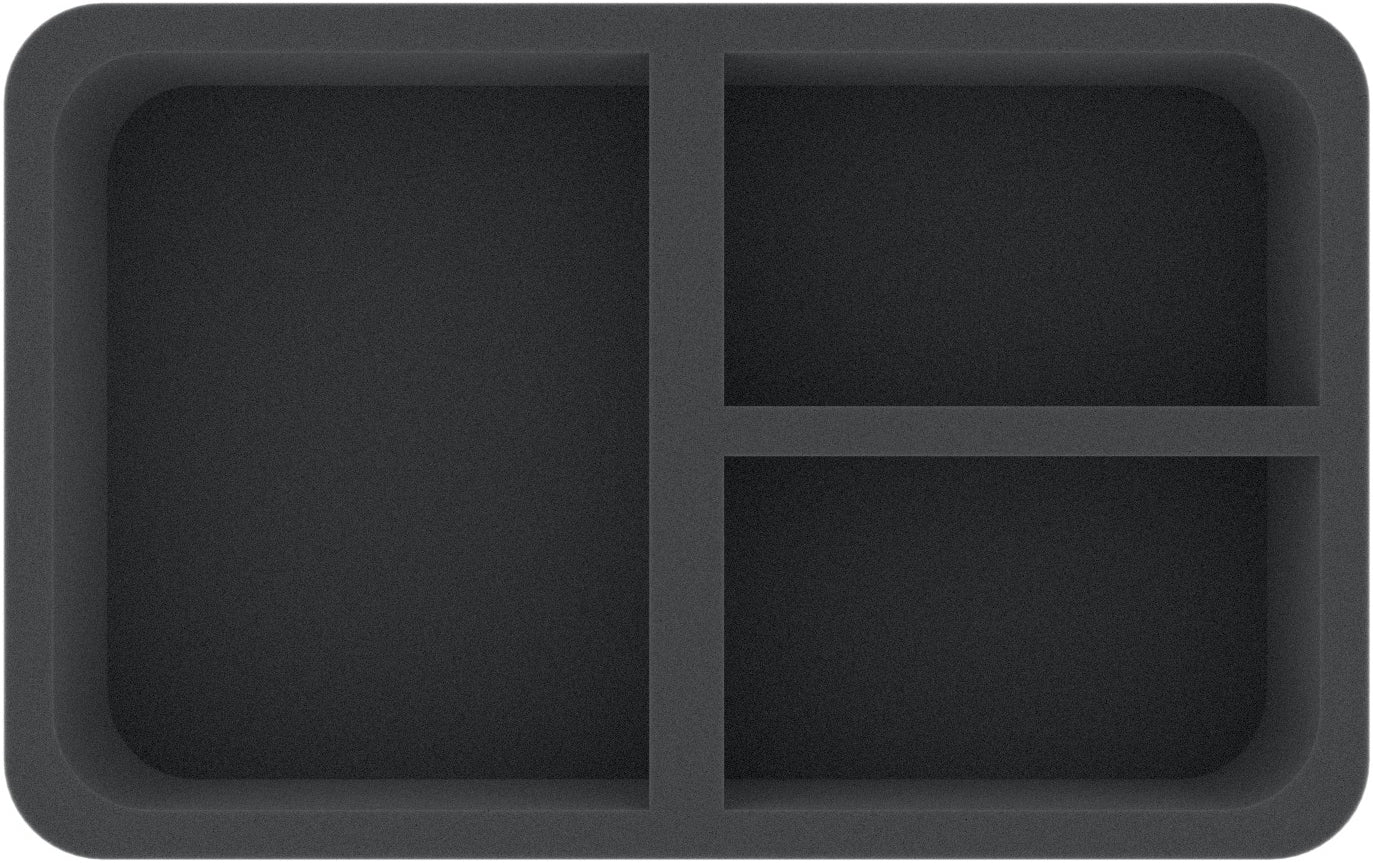 This Half-Size foam tray provides 3 large compartments. It is optimally suited for the safe storage of larger and bulky figures. Also game material, such as tokens or tiles, can be neatly stowed here.