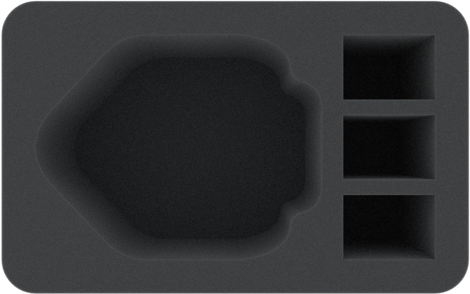 This Half-Size foam insert has 4 compartments of different sizes, one large compartment and three smaller rectangular ones. The large compartment is particularly suitable for larger monster or vehicle miniatures from various board games and tabletop systems. Small models can be stored in the small compartments.