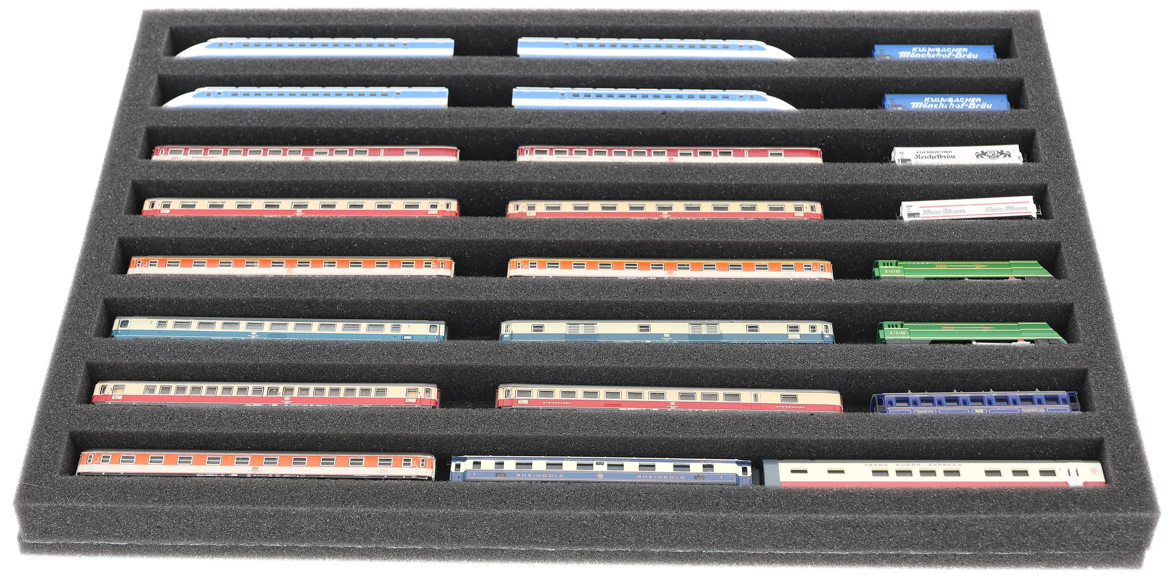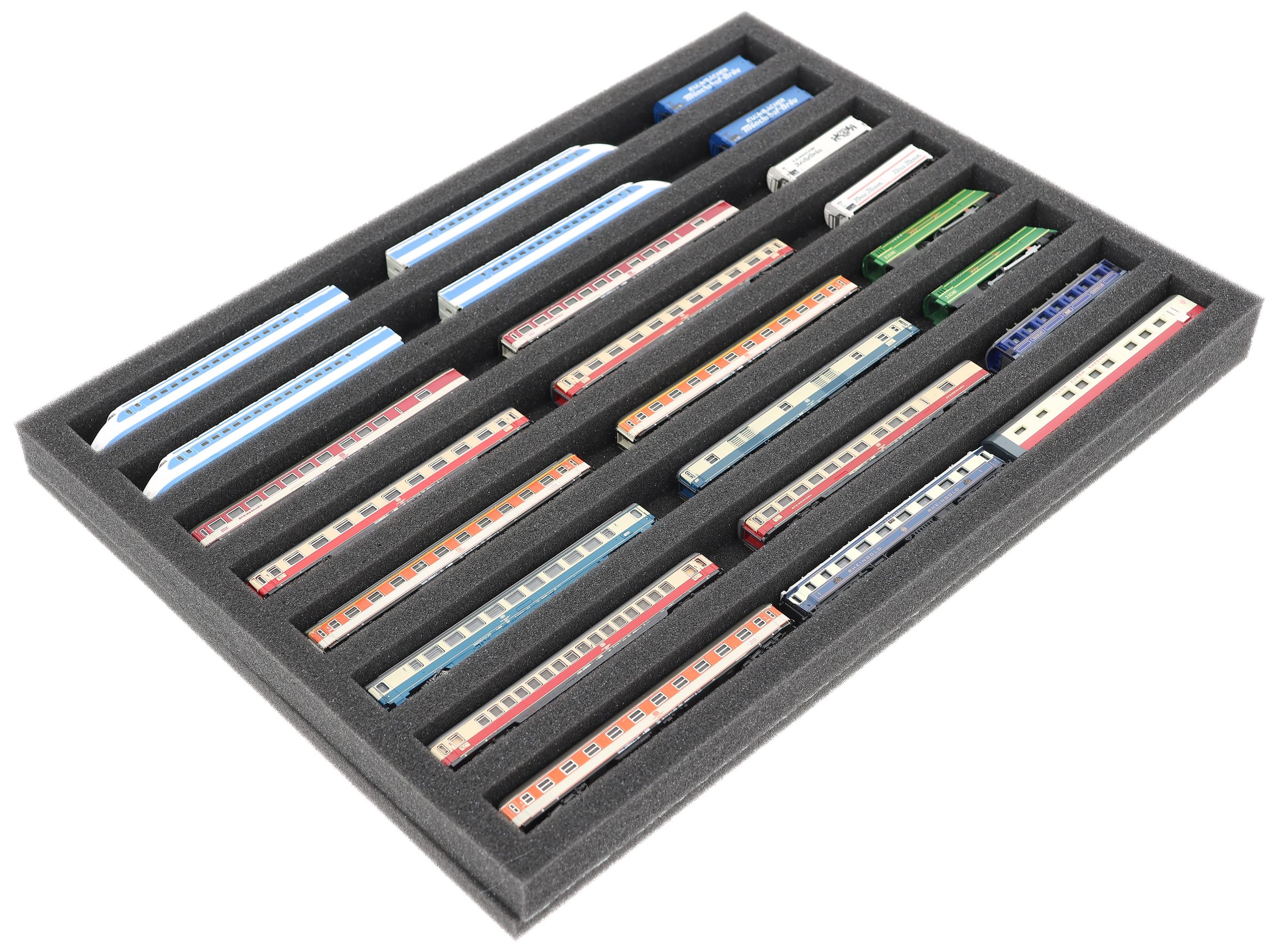 Whether for transport to exhibitions, module meetings, or safe storage on shelves at home, this insert keeps your Z scale locomotives and cars reliably protected. The 8 compartments hold the models horizontally and shield them from bumps and scratches.