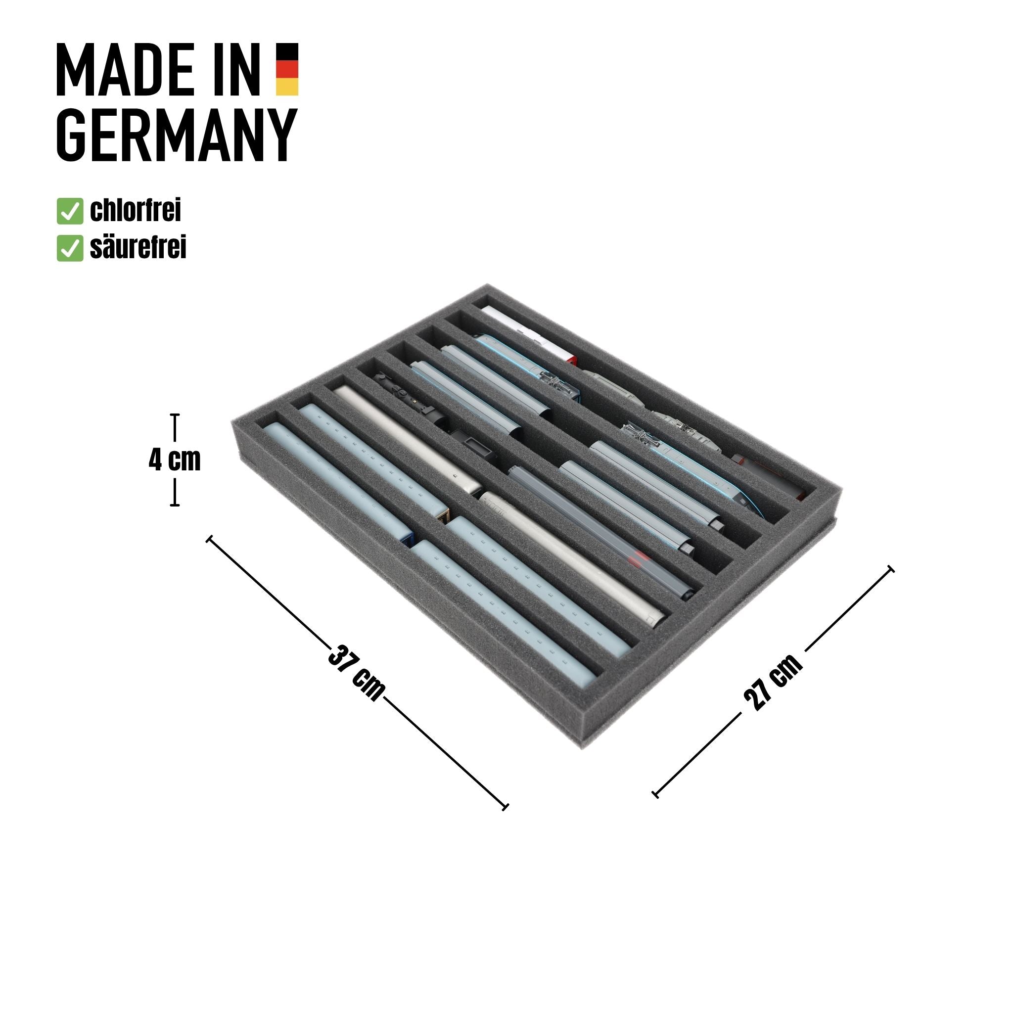 The foam insert has the dimensions: 370 mm x 270 mm x 40 mm total height (30 mm usable height + 10 mm foam base).