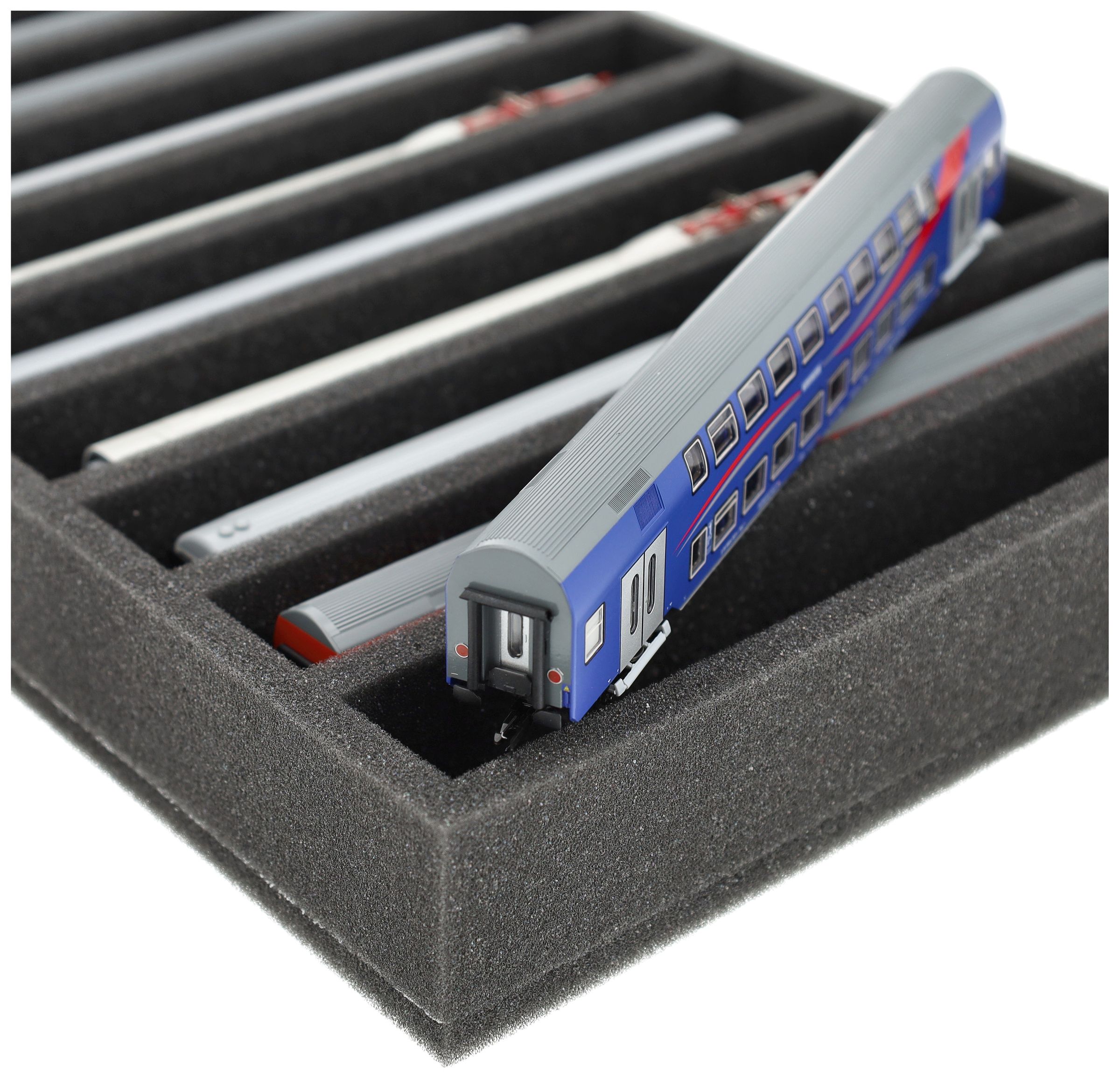 Whether for transport to exhibitions, module meetings, or safe storage on shelves at home, this insert keeps your TT scale locomotives and cars reliably protected. The 9 compartments hold the models upright and shield them from bumps and scratches.