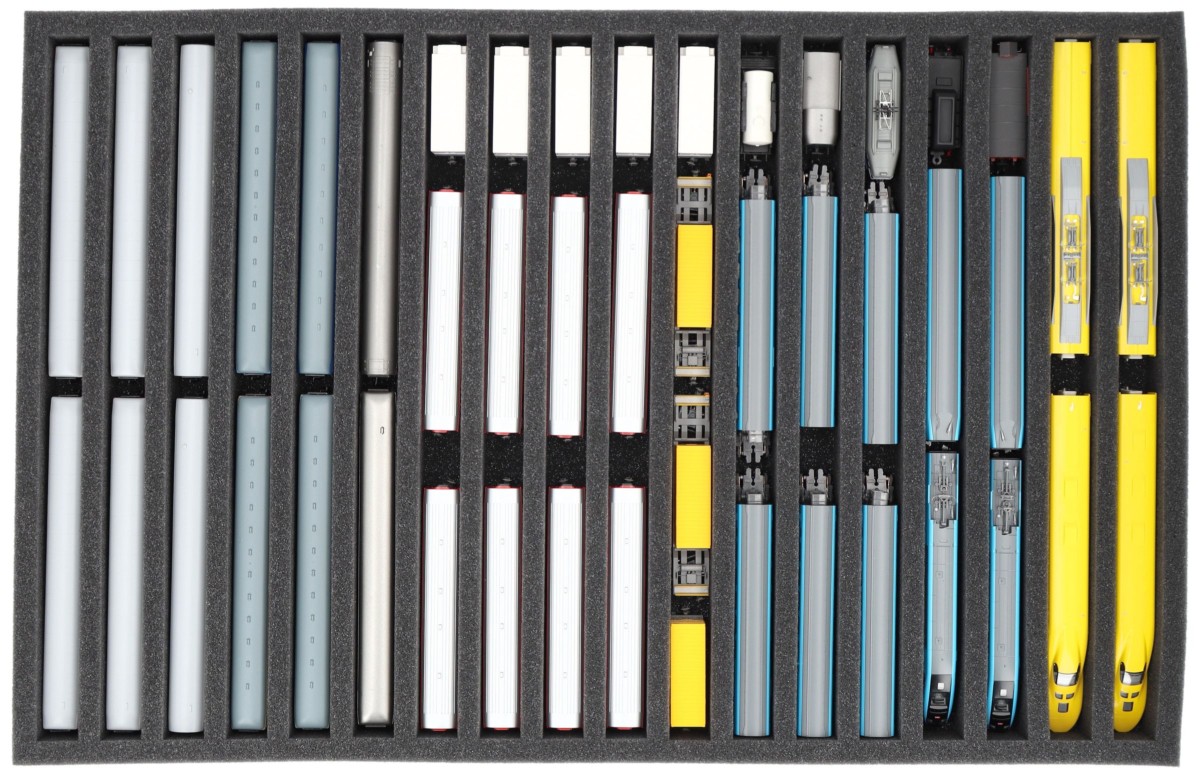 Whether for transport to exhibitions, module meetings, or safe storage on shelves at home, this insert keeps your N scale locomotives and cars reliably protected. The 18 compartments hold the models upright and shield them from bumps and scratches.
