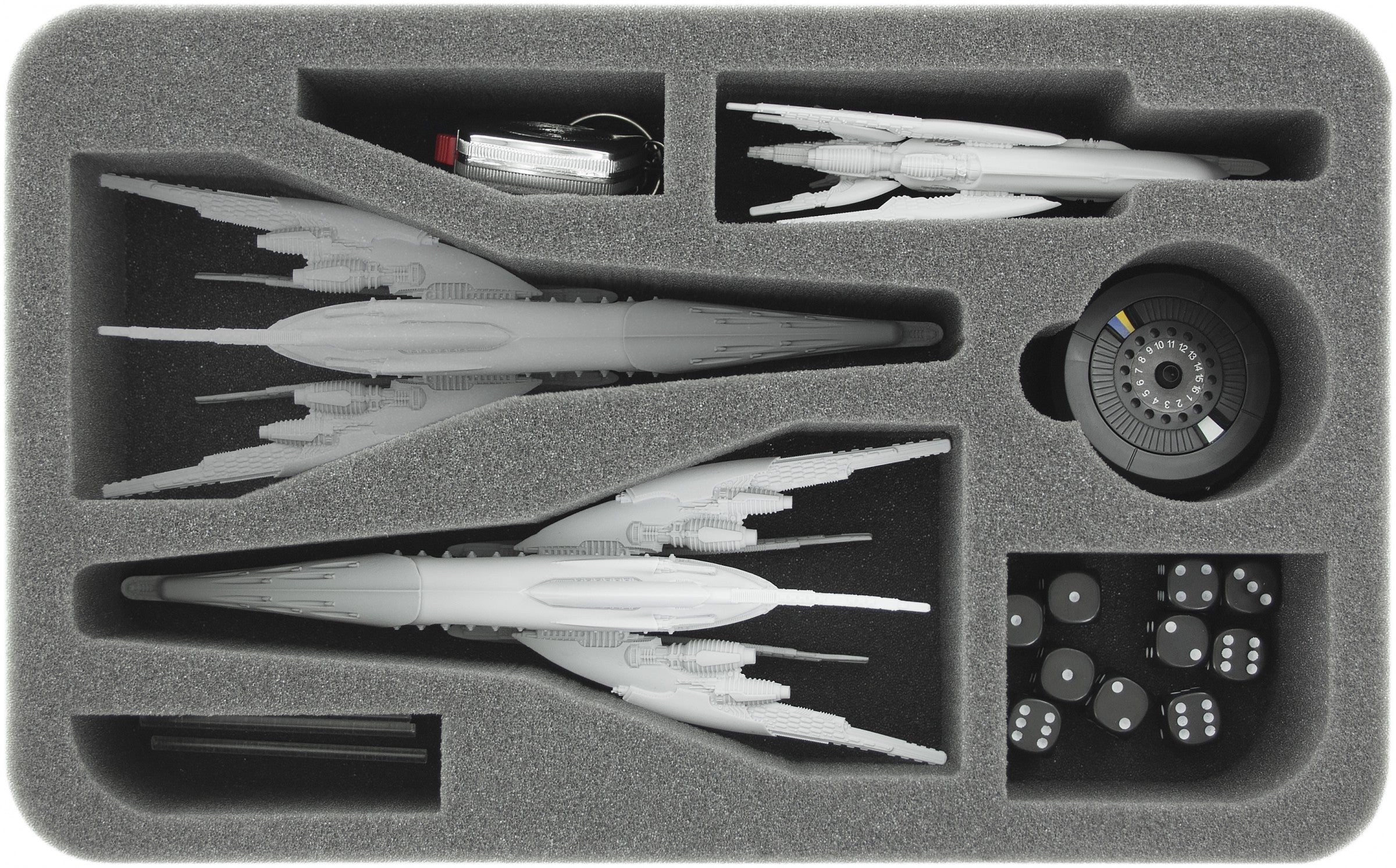 La bandeja de espuma ofrece espacio para 2 acorazados y 1 crucero de la República Post-Humana. Además, hay compartimentos en la bandeja para jugar con el material.
