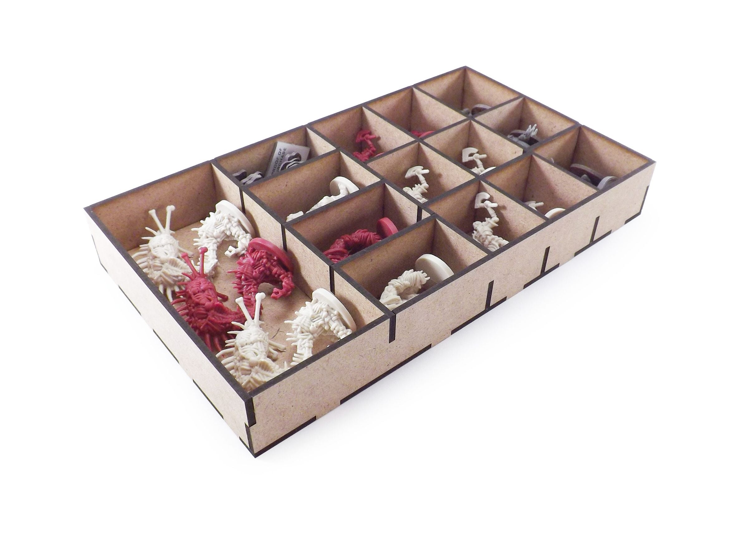 Para poner sobre la mesa la épica lucha entre los valientes héroes y el malvado señor, el juego viene con una gran cantidad de fichas de mapa, monstruos, dados, puertas, fichas y cartas. Nuestra inserción clasifica y agrupa todos estos componentes para un descenso ordenado a la siguiente mazmorra.