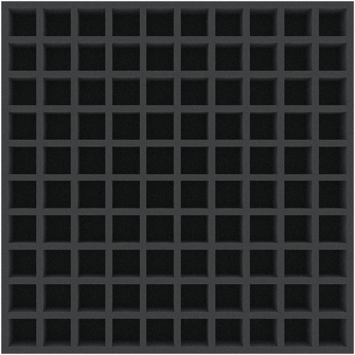 La bandeja de espuma tiene las siguientes dimensiones 500 mm x 500 mm x 60 mm de altura total (50 mm de altura útil + 10 mm de base de espuma).