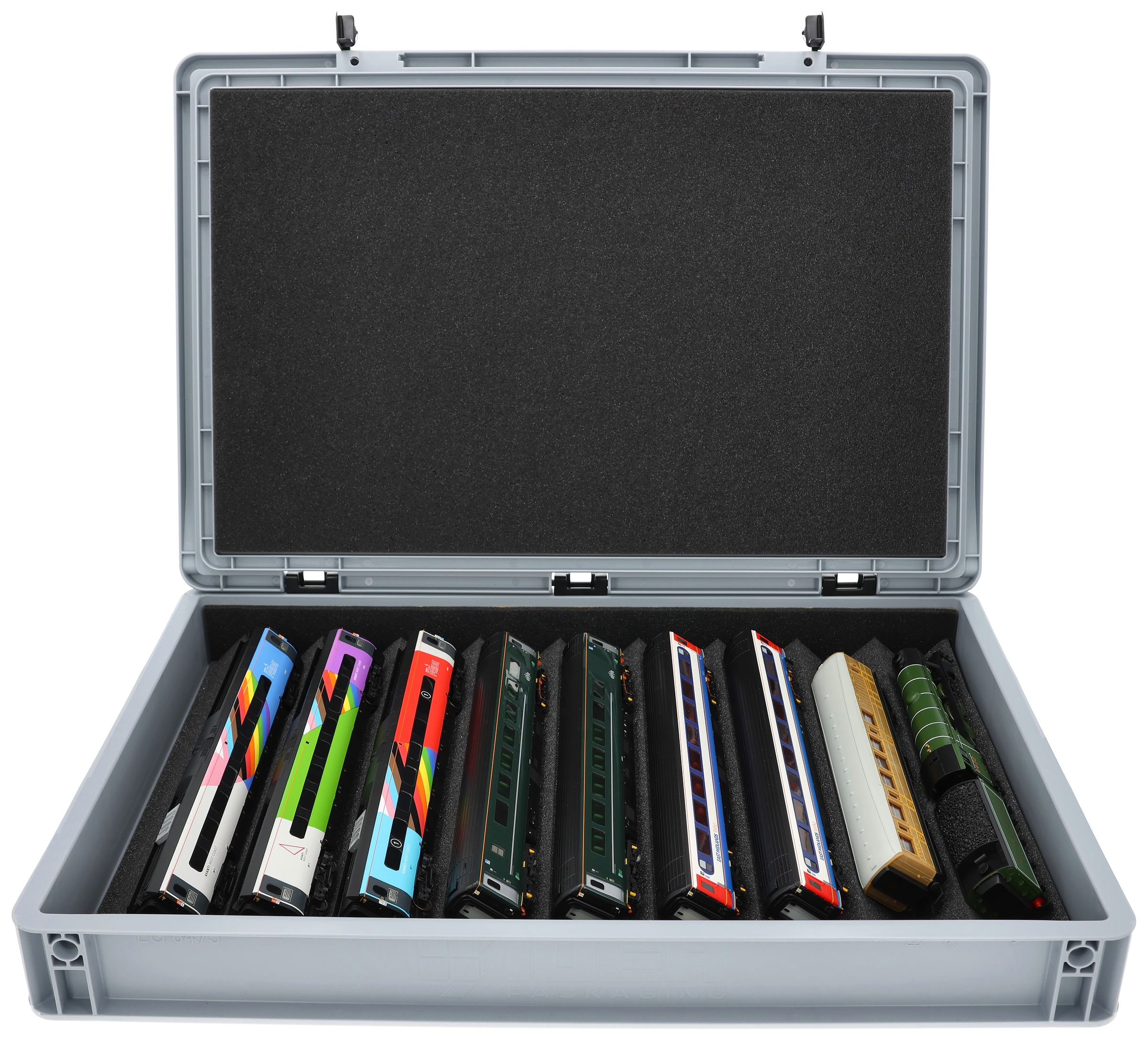 Diez compartimentos, hechos a medida para maquetas de trenes en ancho 00, ofrecen a sus locomotoras y vagones una protección fiable para el almacenamiento y el transporte.