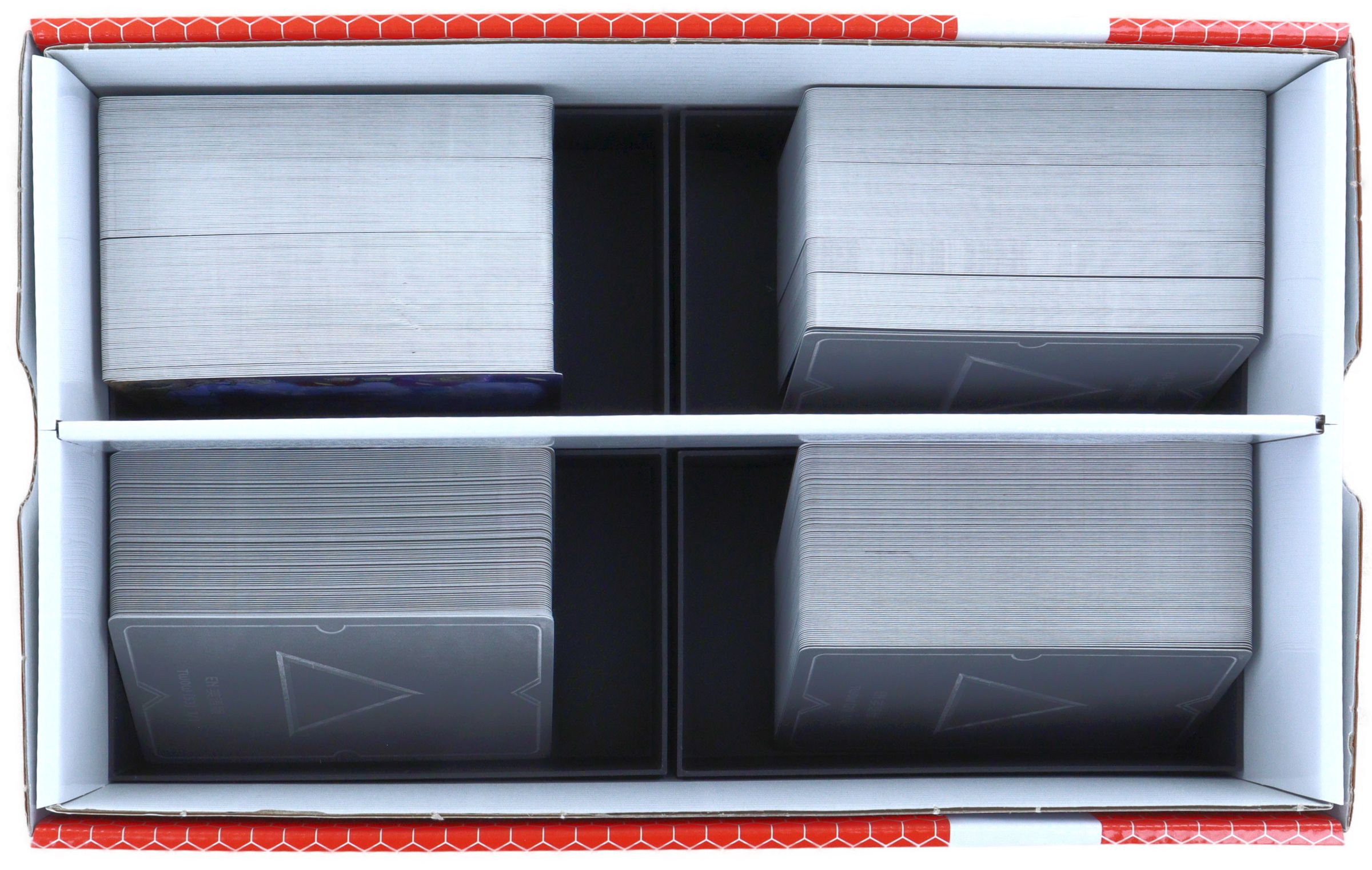 A divider in the middle of the box divides it into two equal-sized compartments. This allows the cards to be lined up neatly without them mixing together during transport.
