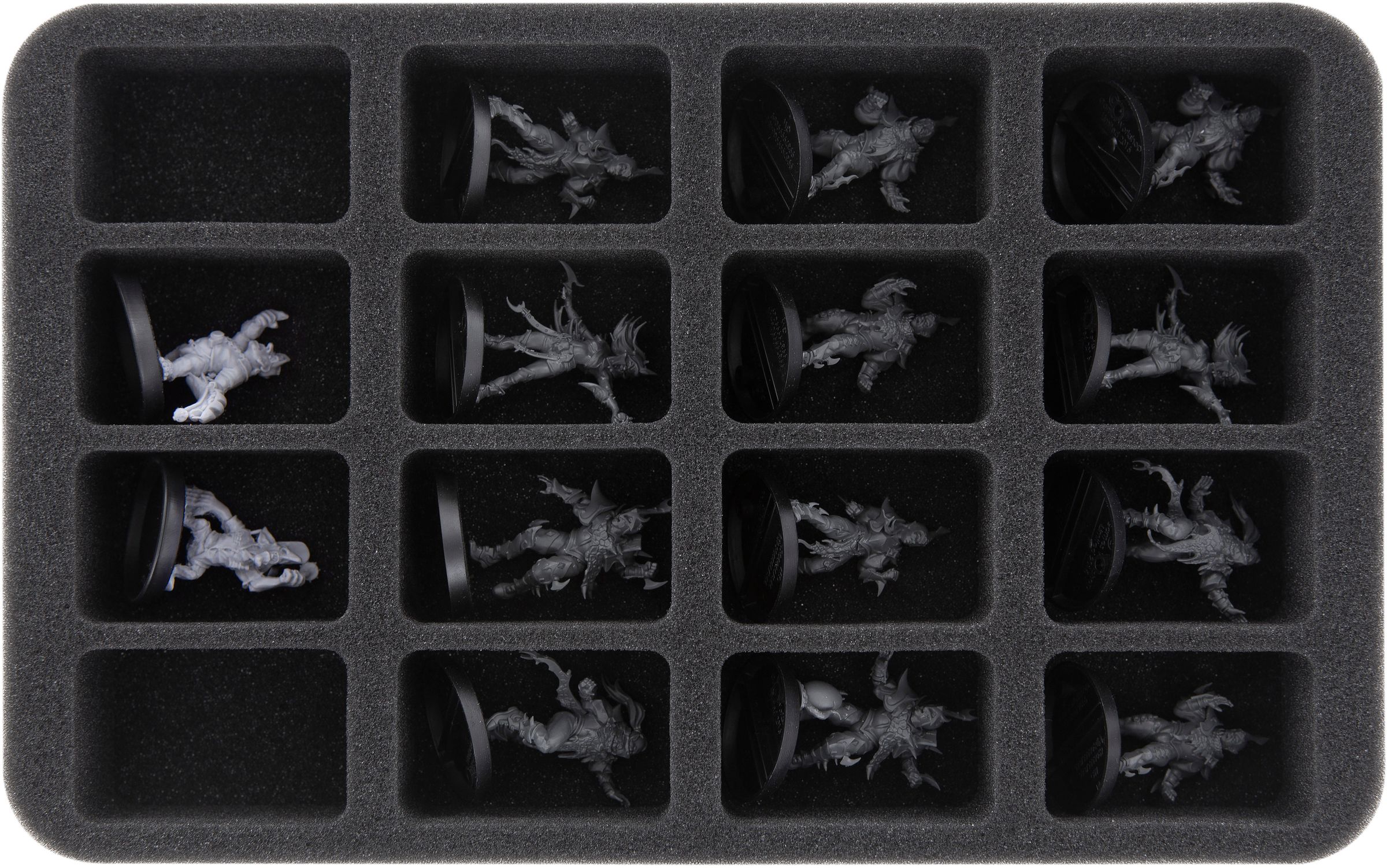 - 1 Half-Size foam tray with 12 compartments for standard figures on up to 40 mm bases like Reaverettes, the Waaghs!, Damned Damsels, and models with similar dimensions (HS050I012BO)