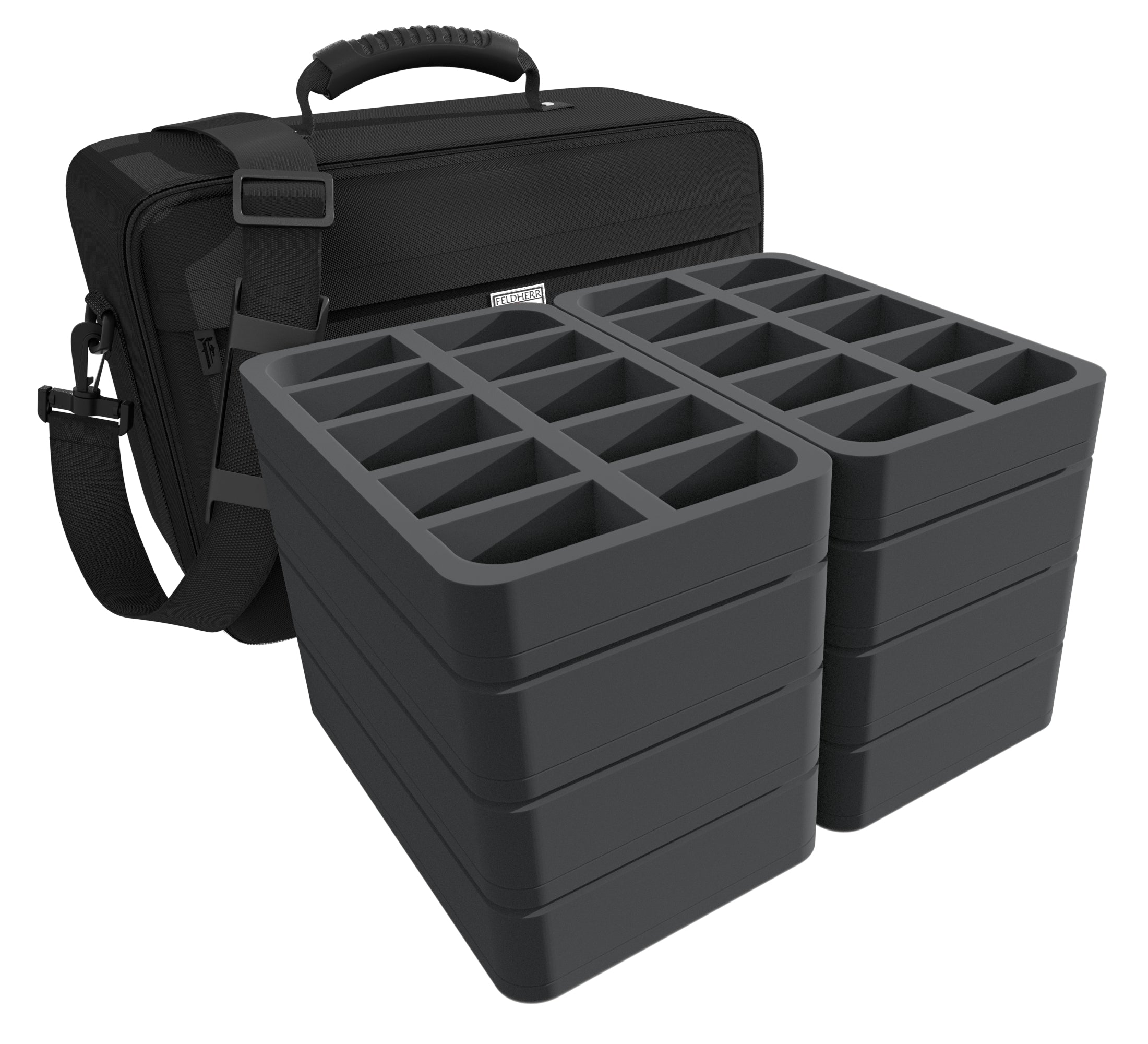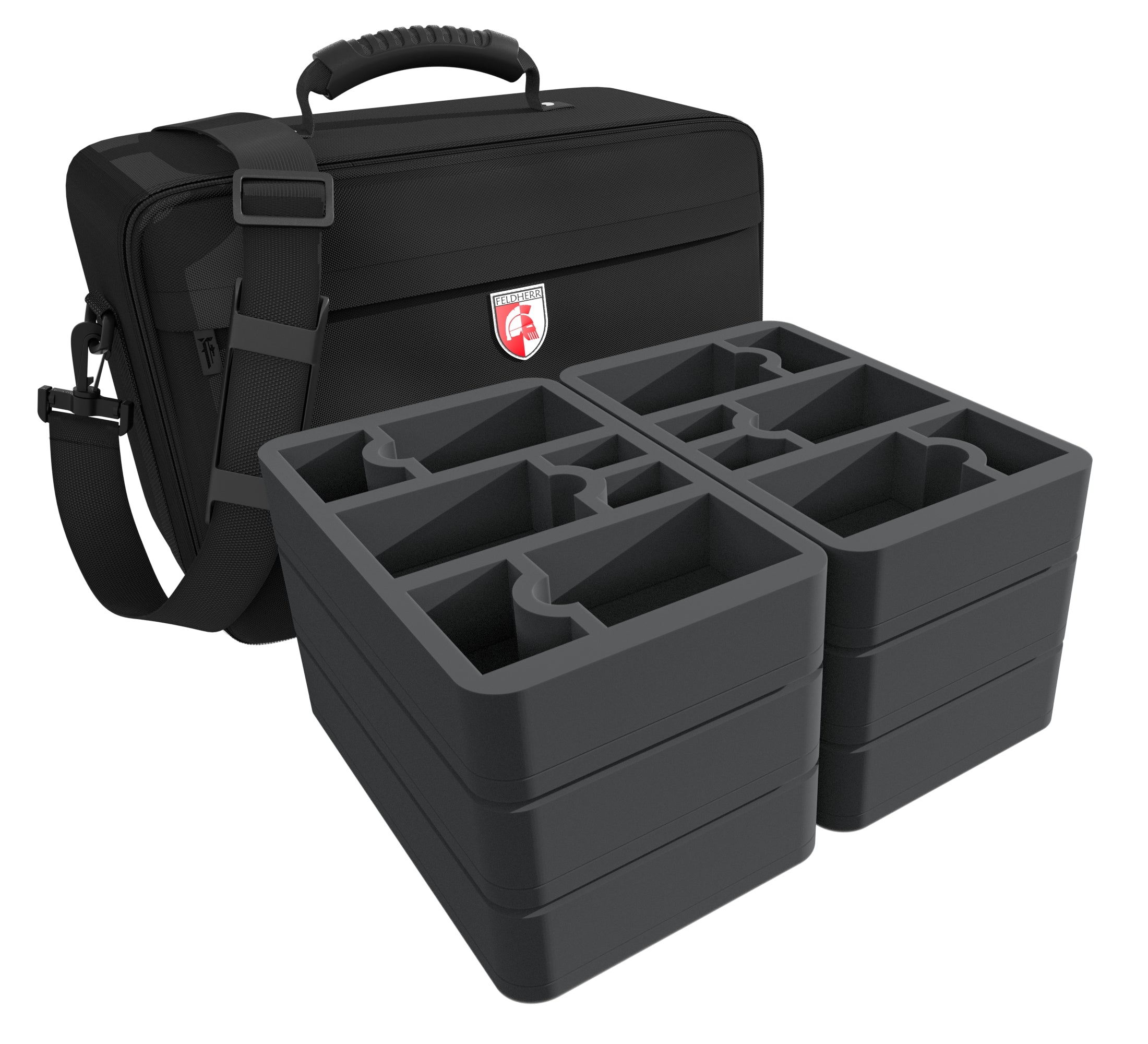 For the well-being of your miniatures, we've packed two foam trays into the bag, each with ten compartments.