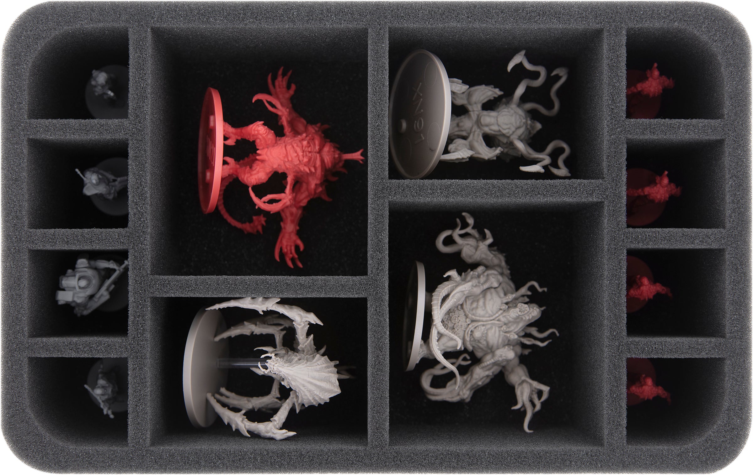 You can store the rulebook, cards, and game material in the Full-Size foam tray with the large compartment (FS050I031BO). Trackers, cards, and other game material, as well as the six hero miniatures, can be sorted into the compartments of the 50 mm high insert FSMEQV050BO.