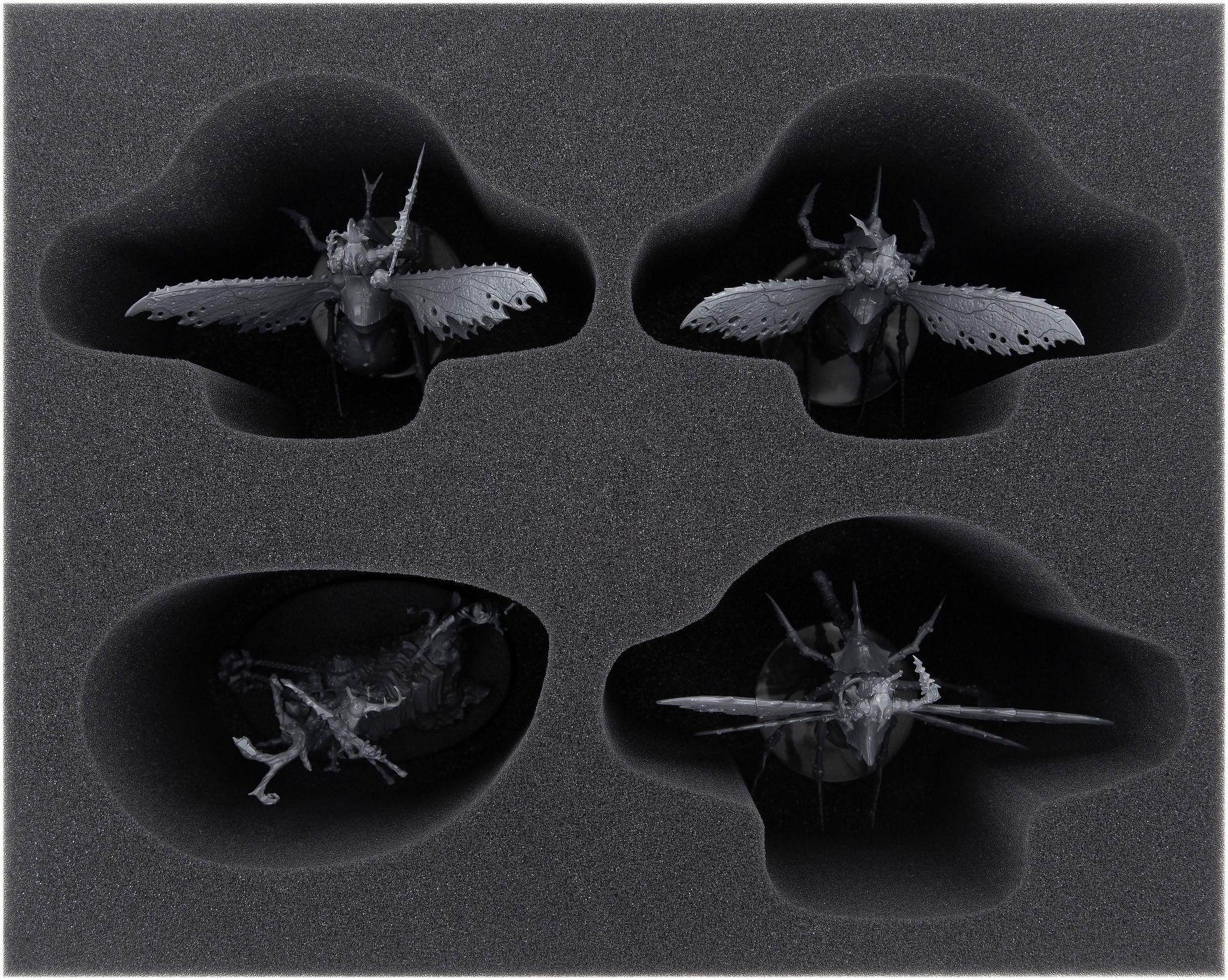 Para cada uno de los tres drones de la peste, la bandeja de espuma FSMEFX115BO ofrece un compartimento exactamente adaptado a la miniatura. Aquí se guardan los modelos de forma segura. Las partes sensibles, como las alas, la Proboscis de Plaga y las cuchillas de los Plaguebearers están óptimamente protegidas contra los daños.