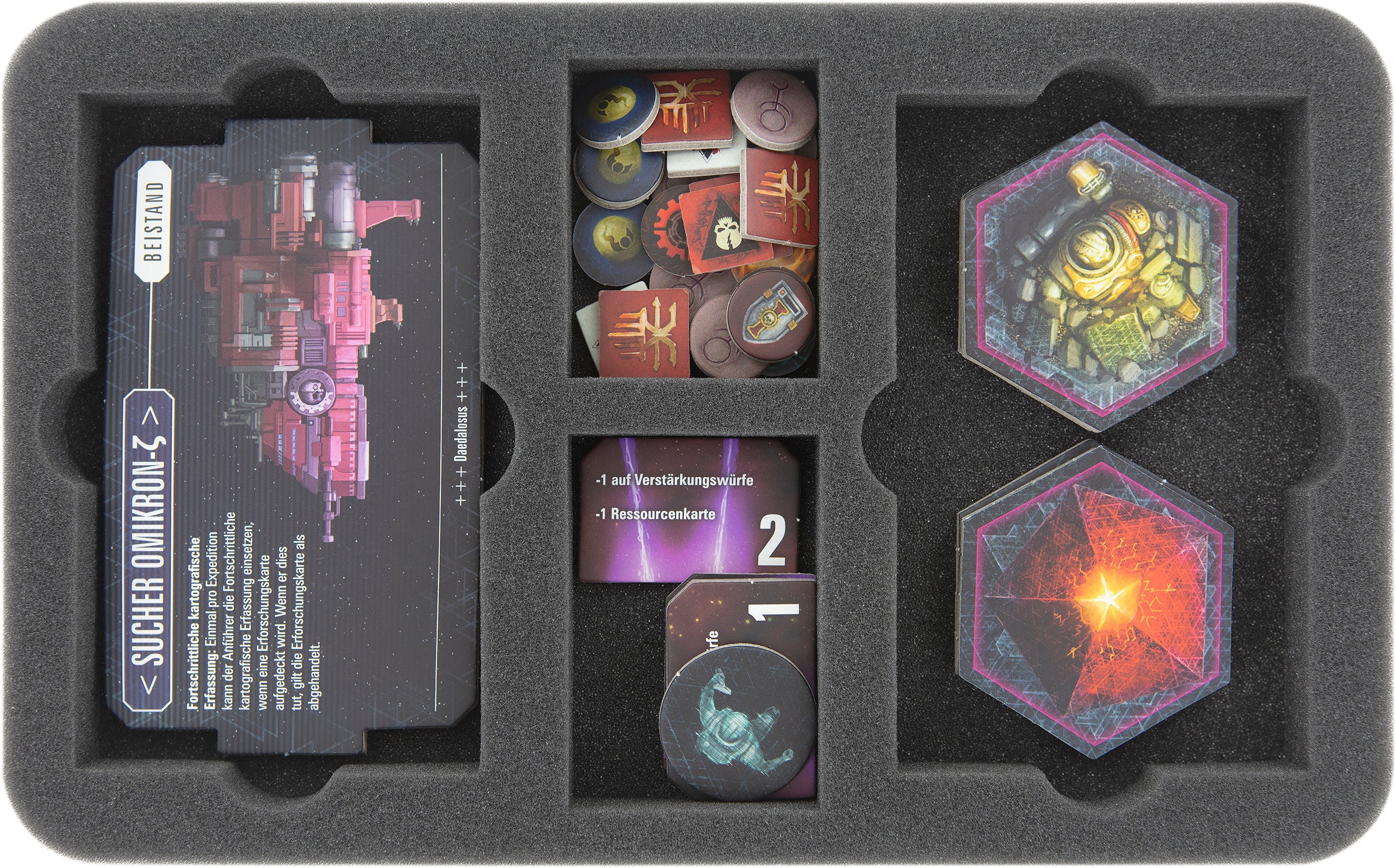 El segundo inserto ofrece al equipo formado por el Comisario Traidor y Chaos Ogryn un escondite seguro con compartimentos en miniatura. Aquí también hay espacio para el material de juego. Un compartimento contiene la ficha de campo hexagonal y los marcadores. El azulejo de doble cara para la nave espacial también tiene su propio compartimiento. Aquí también se almacenan las tarjetas de Encuentro y Descubrimiento. Las tarjetas de la expansión'Endless Peril' también caben en esta bandeja. Queda un compartimento para las pequeñas tarjetas Discovery y Soul Price.