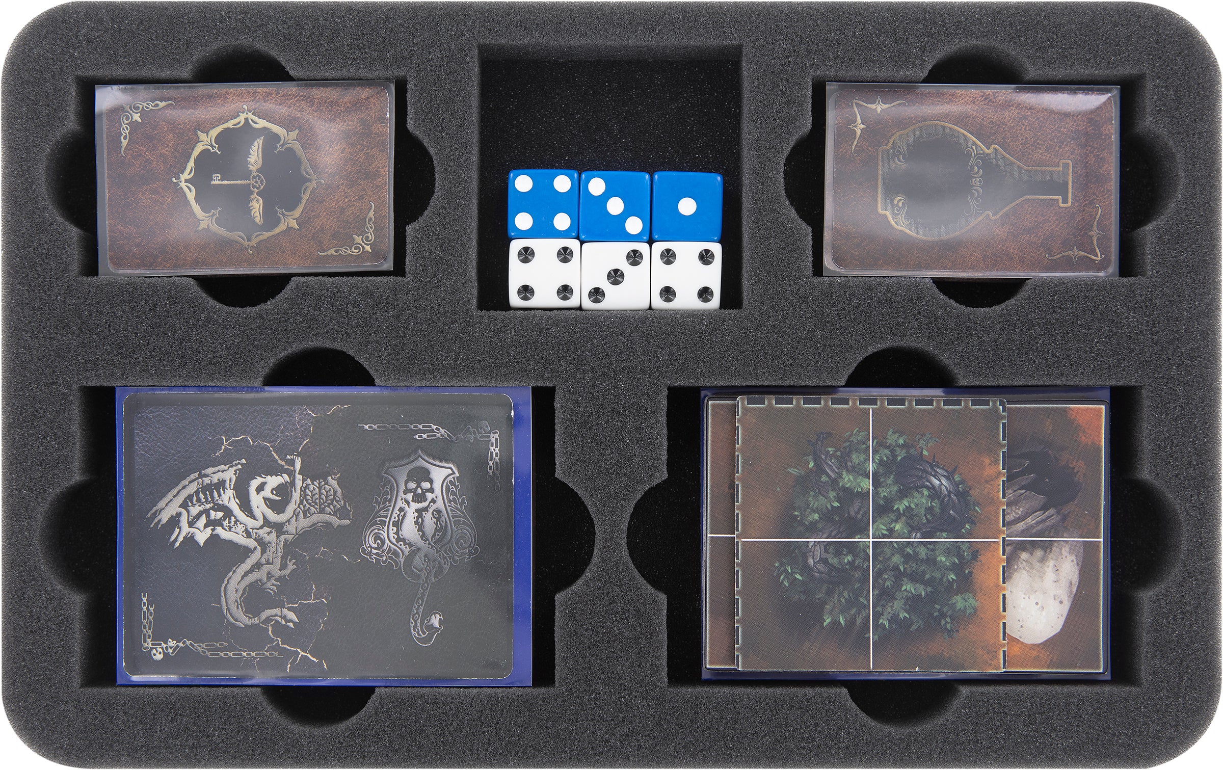 • 2 Half-Size foam tray with 5 compartments for cards, dice, and markers (HSMEQB030BO)