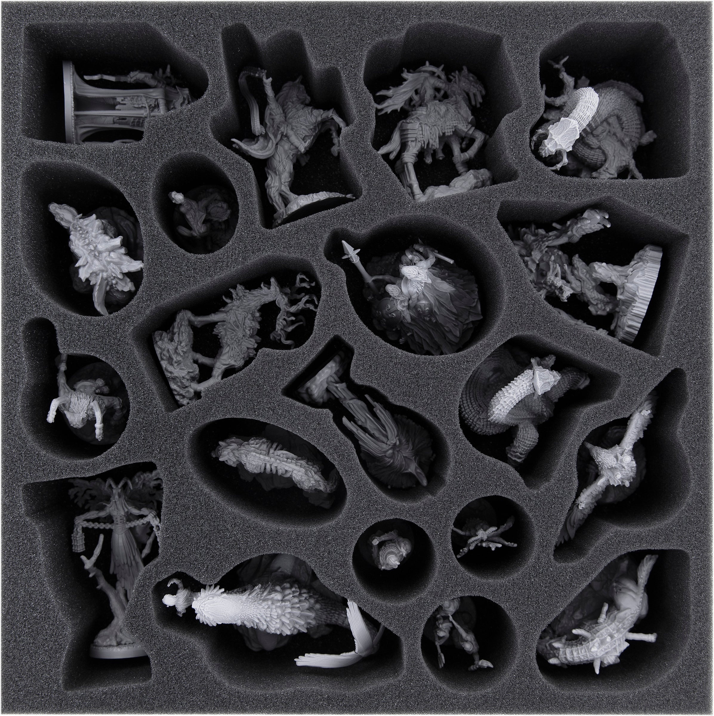 Para que las más de 40 figuras estén bien protegidas, el Bundle incluye cuatro plantillas individuales de espuma que encajan perfectamente en las respectivas cajas de los juegos de mesa. Cada miniatura, ya sea un Asno o un Beor completamente cargado, tiene su propio compartimento. Las miniaturas de la caja Monstruos de Avalon tienen incluso compartimentos cortados con precisión. Gracias a los compartimentos cortados a medida, las miniaturas encajan perfectamente y no pueden deslizarse ni chocar entre sí durante el transporte.