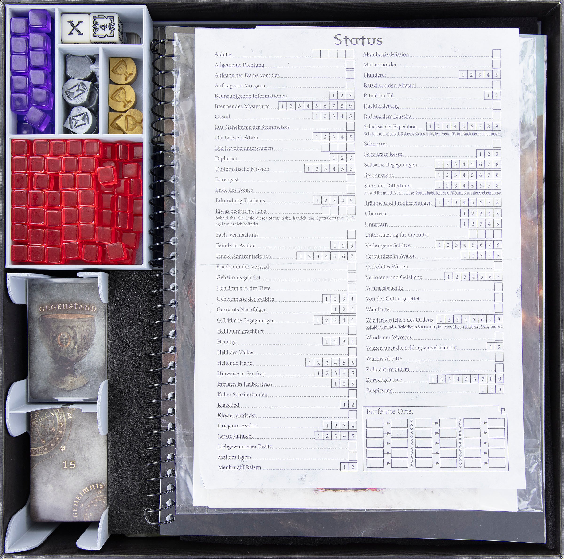 - Cuatro insertos de espuma proporcionan una protección óptima para las miniaturas y un almacenamiento claro para los materiales del juego. De este modo, el inserto para "Monstruos de Avalon" tiene la forma precisa para las 20 miniaturas del Pack de Miniaturas.