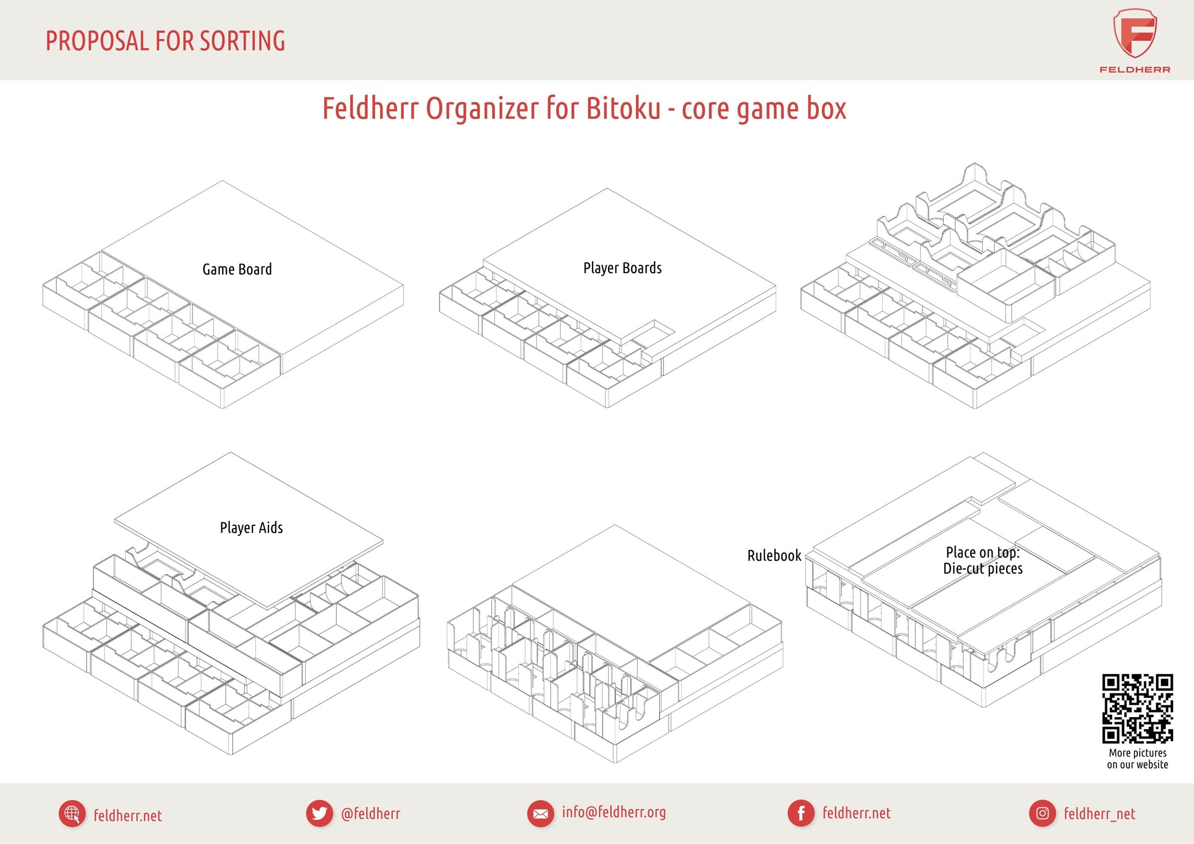 • Store the Game board and player boards/Tengu board in the game box. Rulebooks, player aids, and large die-cut pieces are stored on the Organizer.