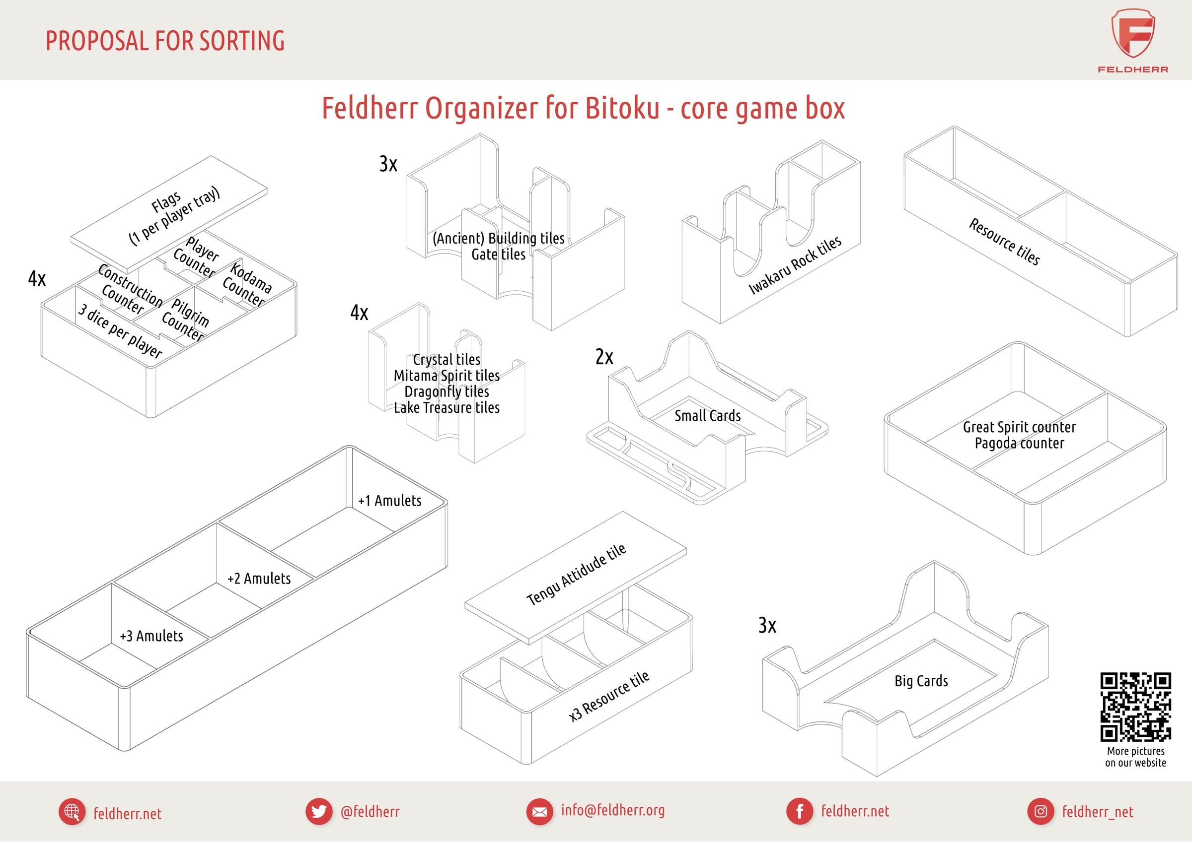 • The inserts ensure order in the box and on the tabletop. Place the card holders with the Bitoku, Yokai, and vision cards and the tile holders with the Building, Crystal, Mitama Spirit, and Dragonfly tiles directly on the Game board.
