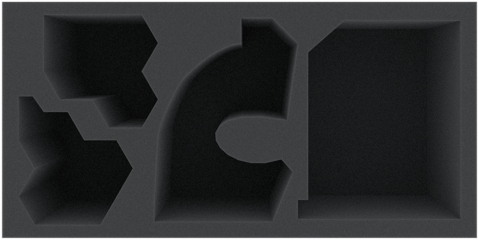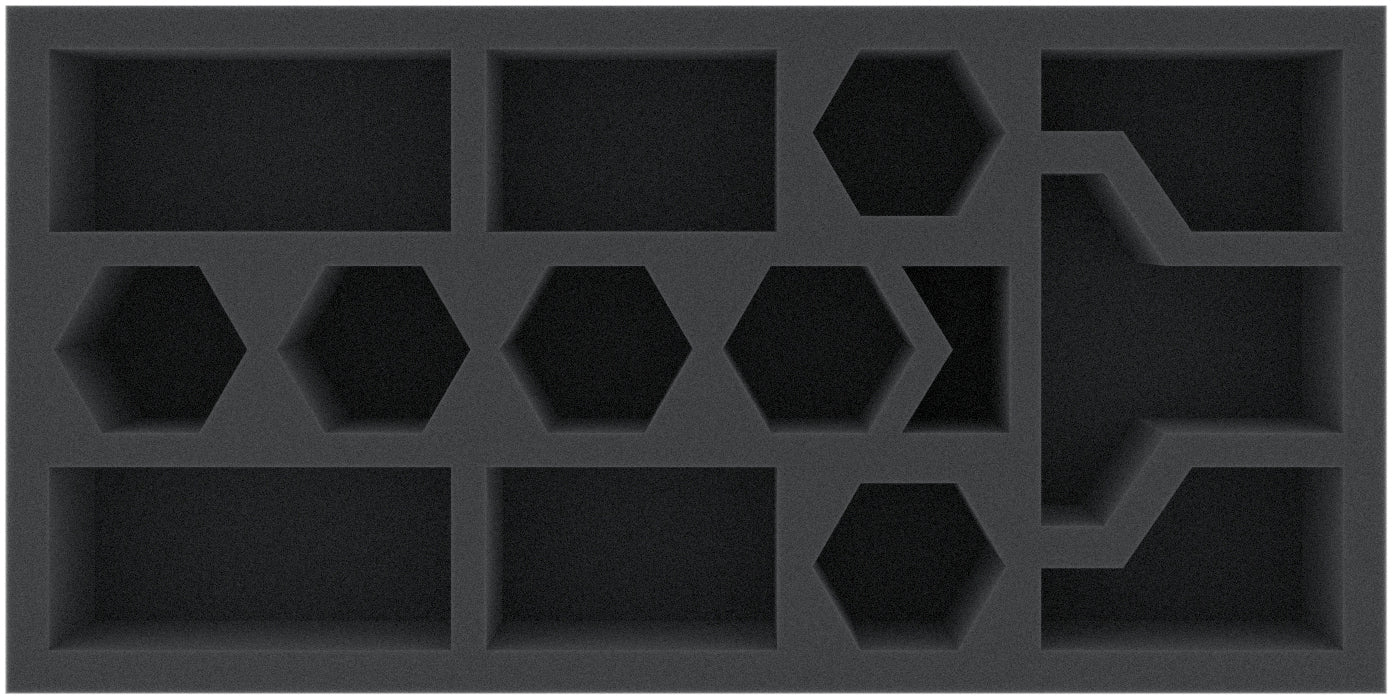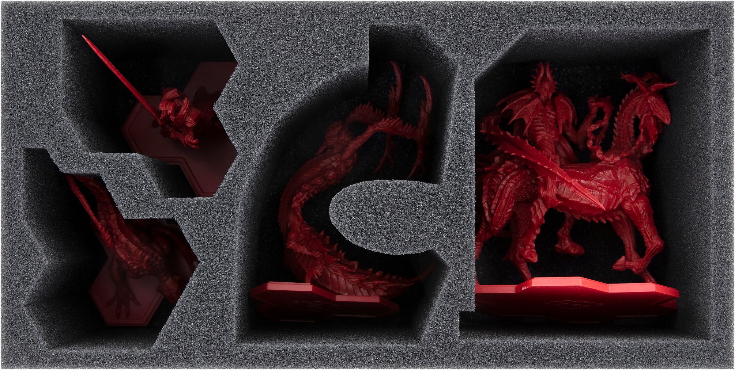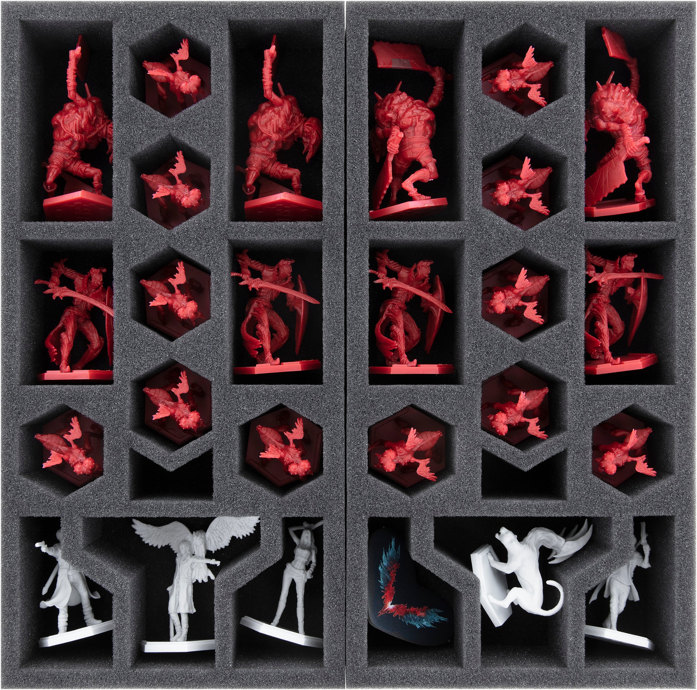 - 1 foam tray with 4 compartments for large miniatures like Riot, Proto Angelo, Elder Geryon Knight, Empusa Queen
