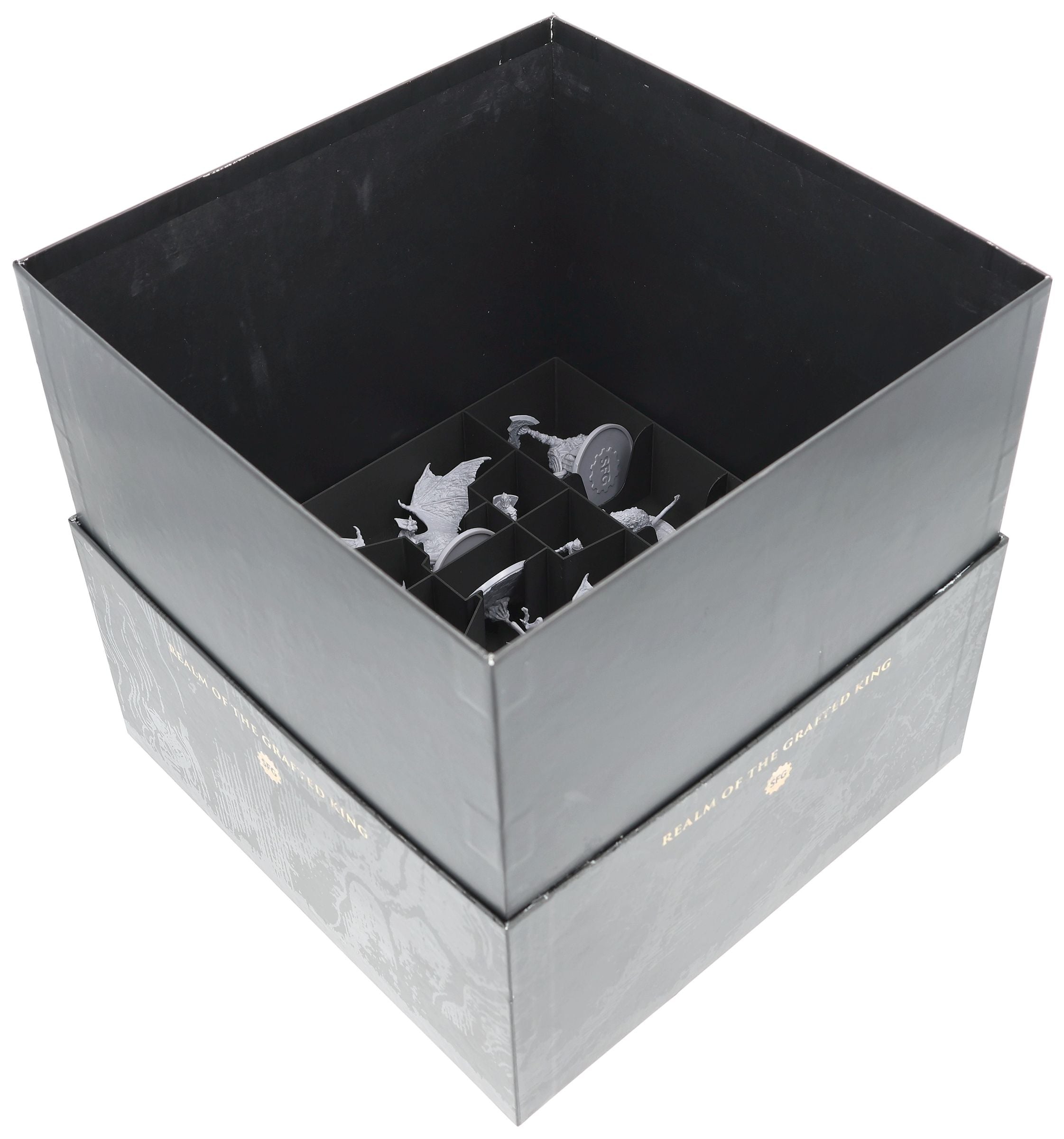 - Individually customized compartments for miniatures protect them from damage during storage and transport