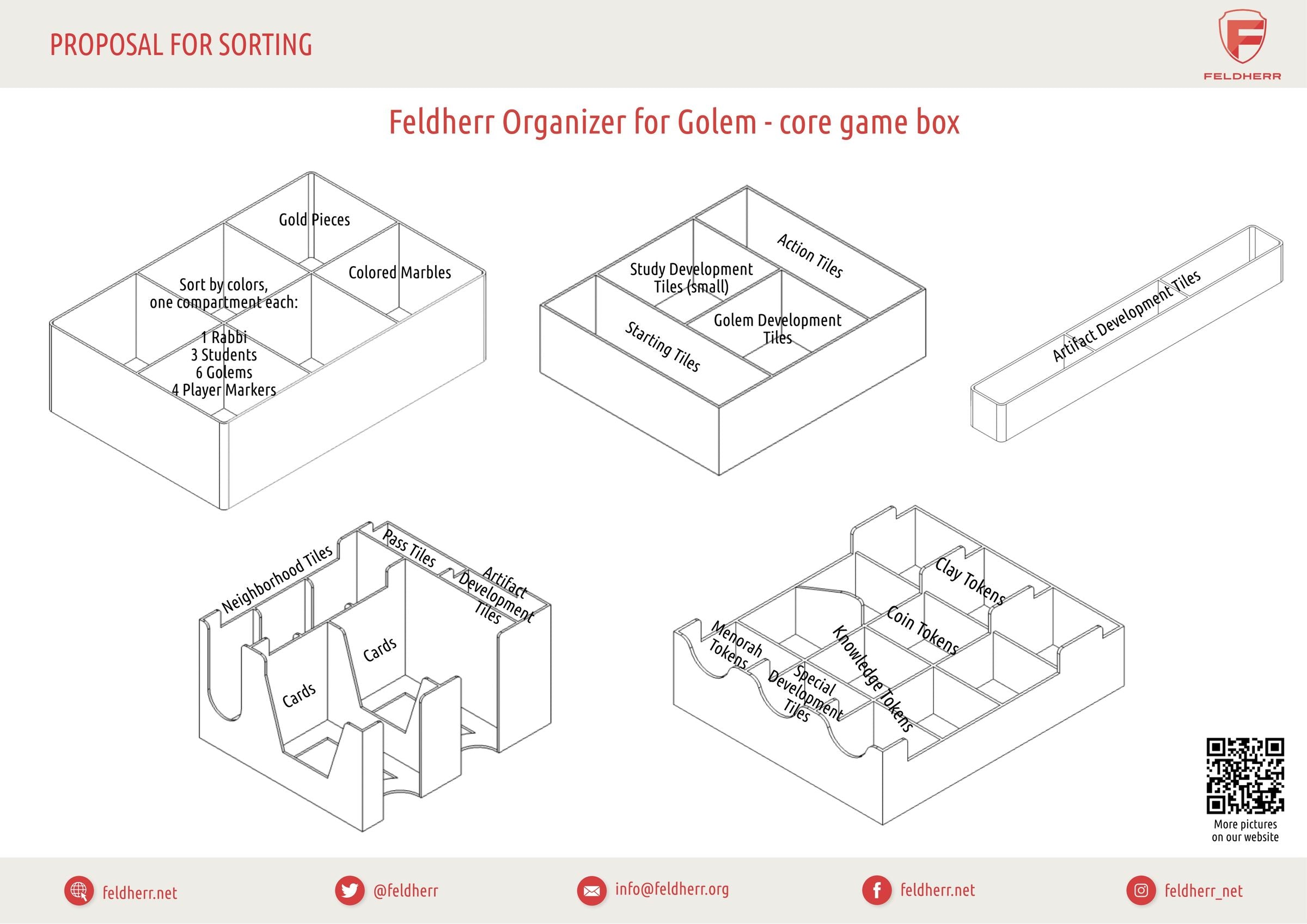 • 1 plastic token holder with 5 compartments for small-sized game materials like wooden figures (Rabbi, Students, Golems, Player markers, sorted by color), Gold pieces, and marbles