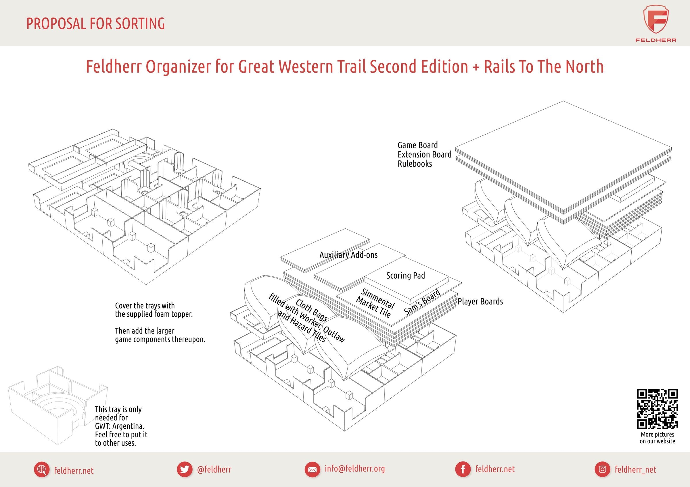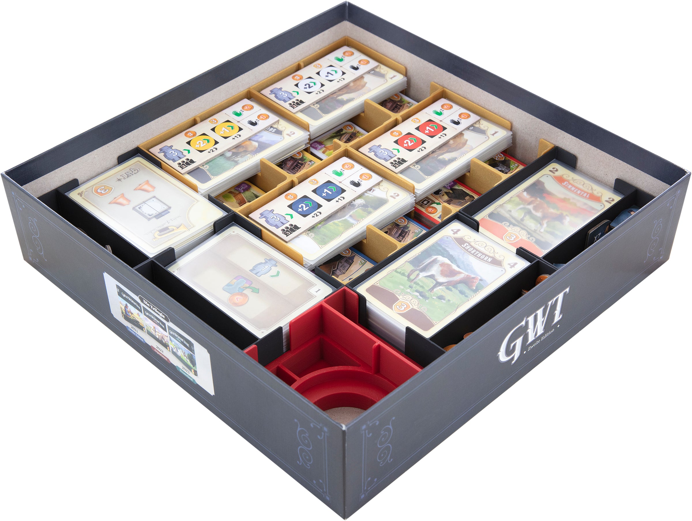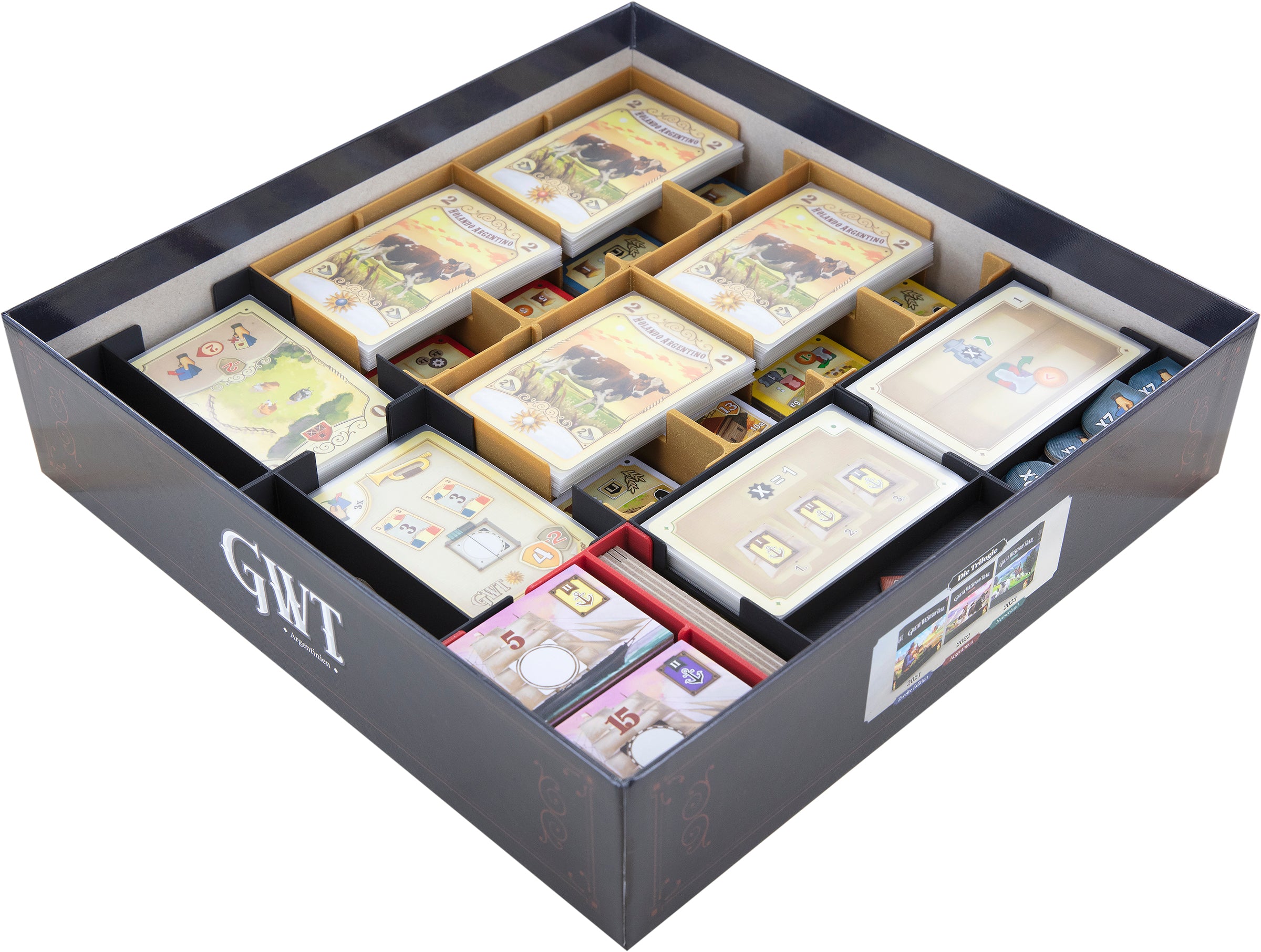 • Para su uso con "Great Western Trail: Argentinien", se incluye una bandeja roja para guardar las fichas de país y de barco.