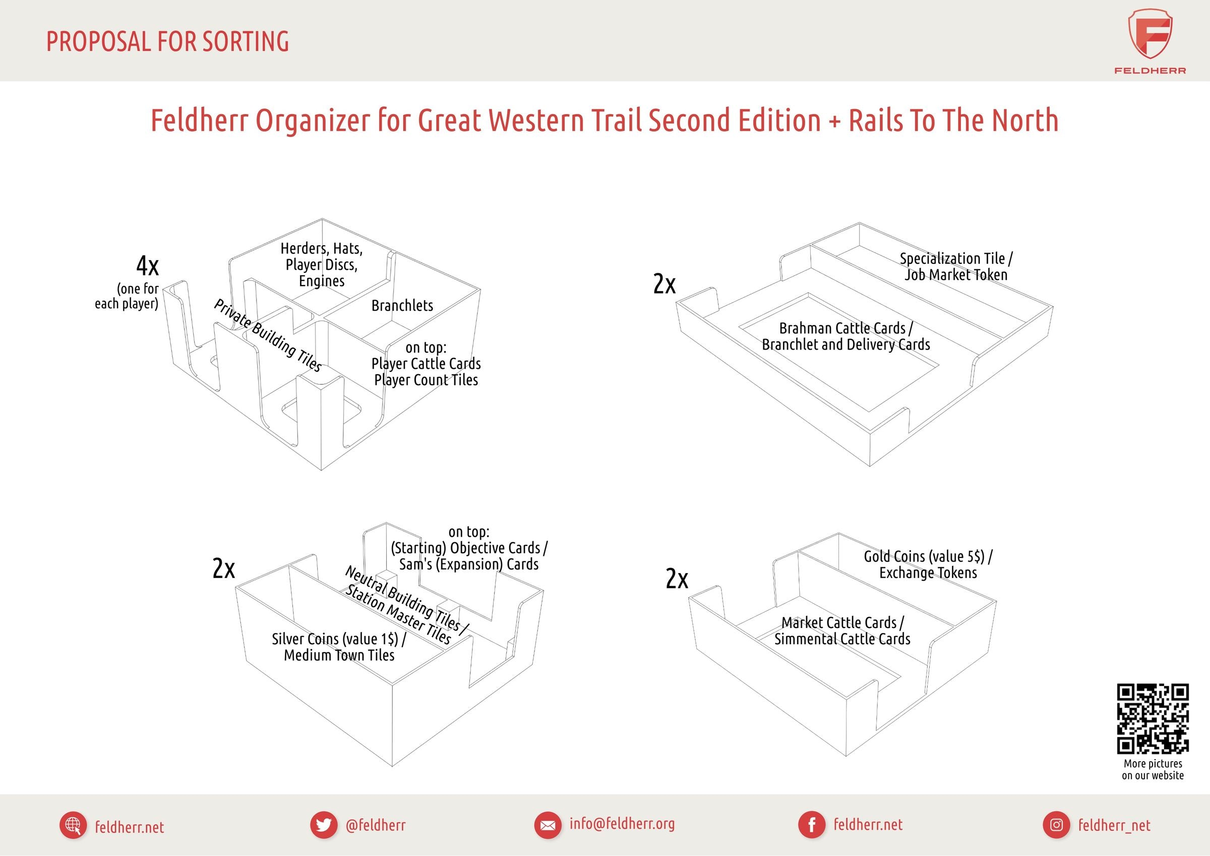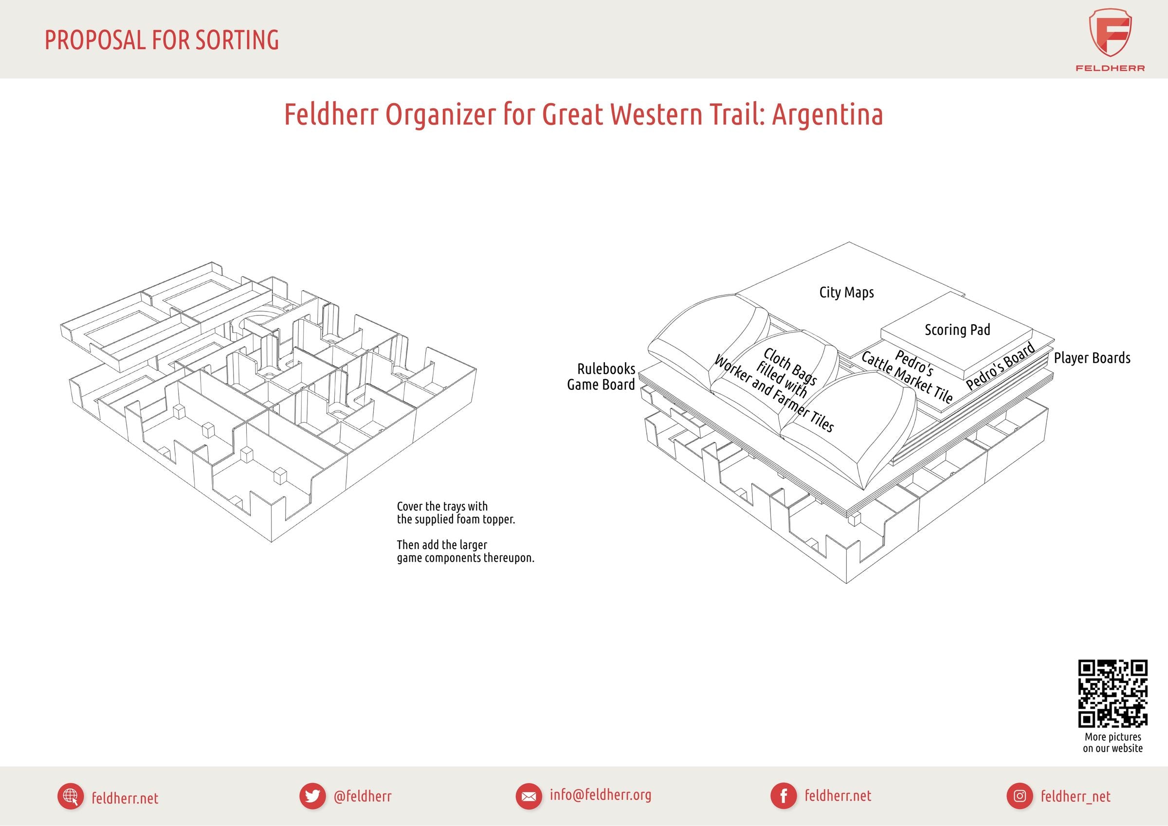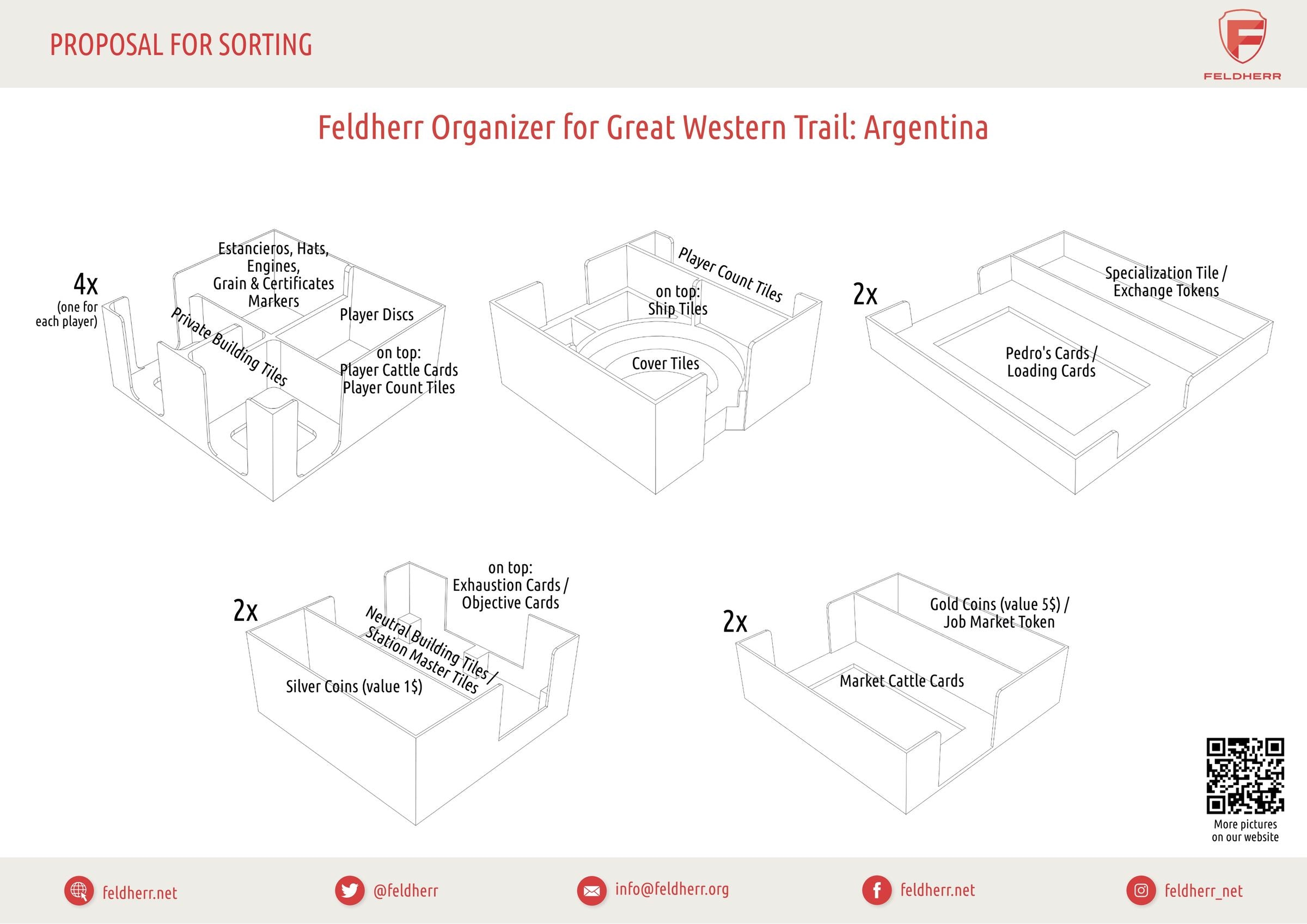 Ponga fin a la laboriosa tarea de clasificar y ordenar fichas, tarjetas y accesorios al principio de cada partida. Con los soportes para fichas y tarjetas Feldherr del Organizer, todo estará bien guardado y justo donde lo necesita. Desde el indicador del mercado laboral hasta un puñado de pesos: cada ficha, tarjeta y tarjeta encuentra su lugar designado. Las bandejas facilitan la limpieza después de la partida y garantizan un comienzo rápido. Saque las bandejas y las bolsa de tela llenas de la caja de juego y distribúyalas sobre el tablero, así tendrá más tiempo para disfrutar plenamente del juego.