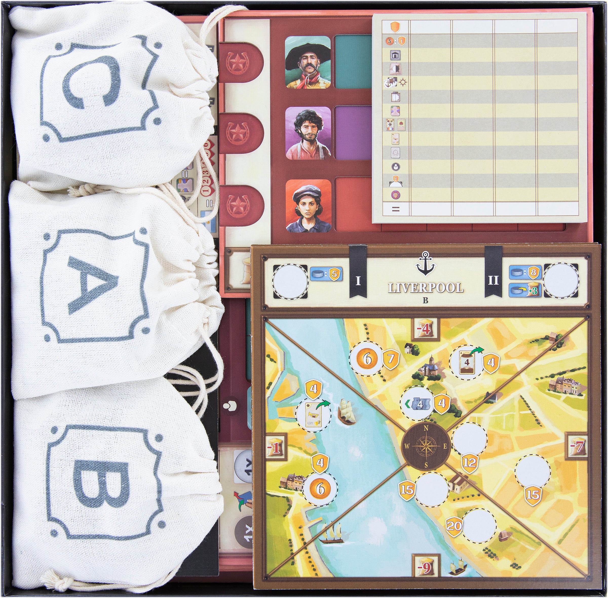 • 2 tarjeteros de plástico, cada uno con 2 compartimentos y una repisa para cartas de contrato y cartas de agotamiento, además de componentes de juego de pequeño tamaño como fichas pequeñas, marcadores, monedas e indicadores.