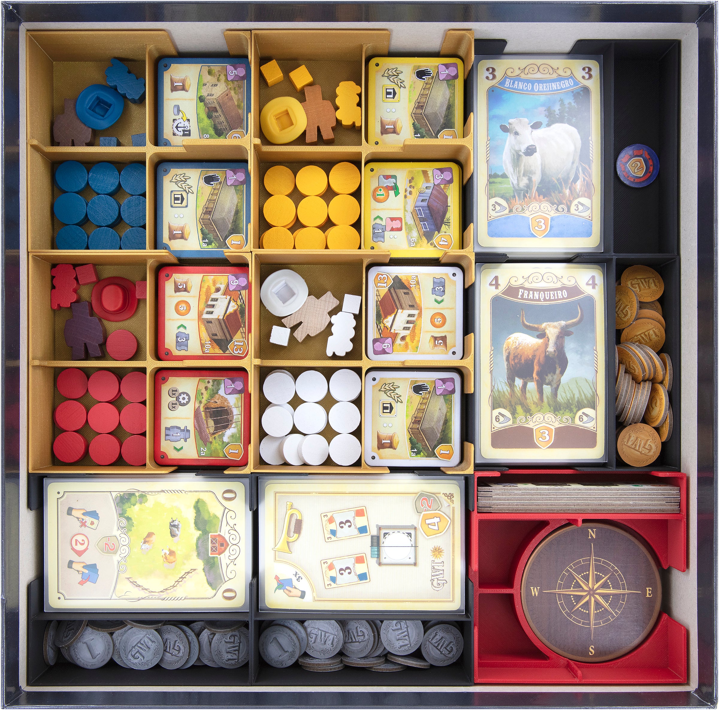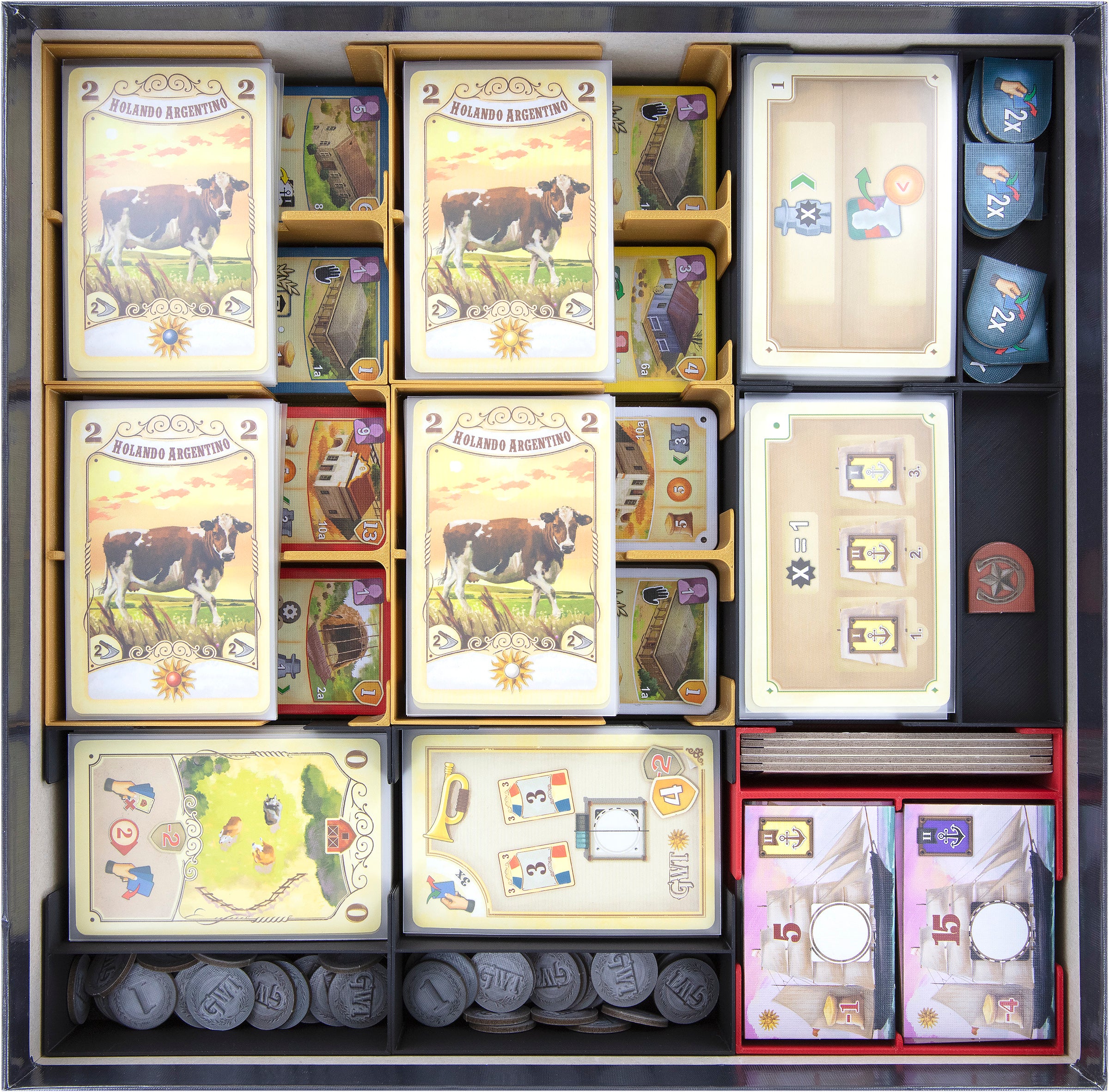 • 2 tarjeteros altos de plástico, cada uno con 2 compartimentos para cartas de ganado y componentes de juego de pequeño tamaño como monedas, marcadores e indicadores.