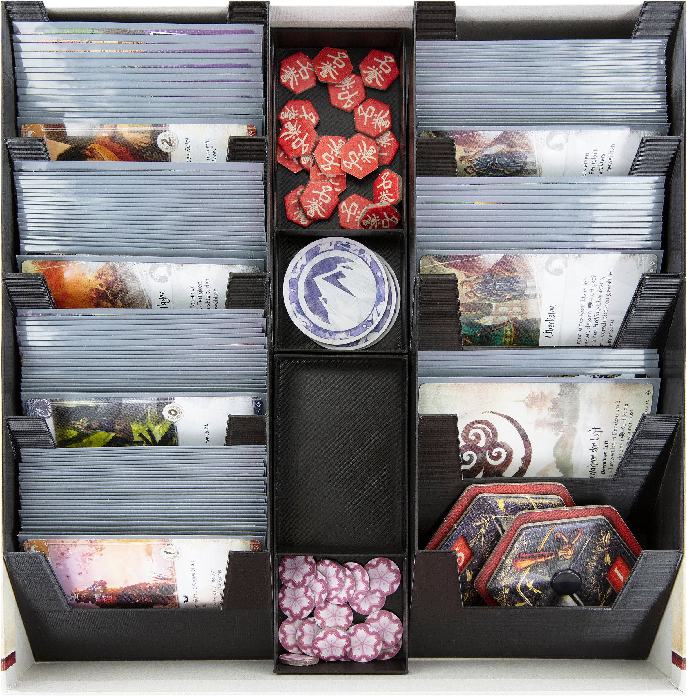 - 4 card holders for game cards (Stronghold cards, Province cards, Dynasty cards, Role cards, Conflict cards, Reference cards and the Imperial Favor card)