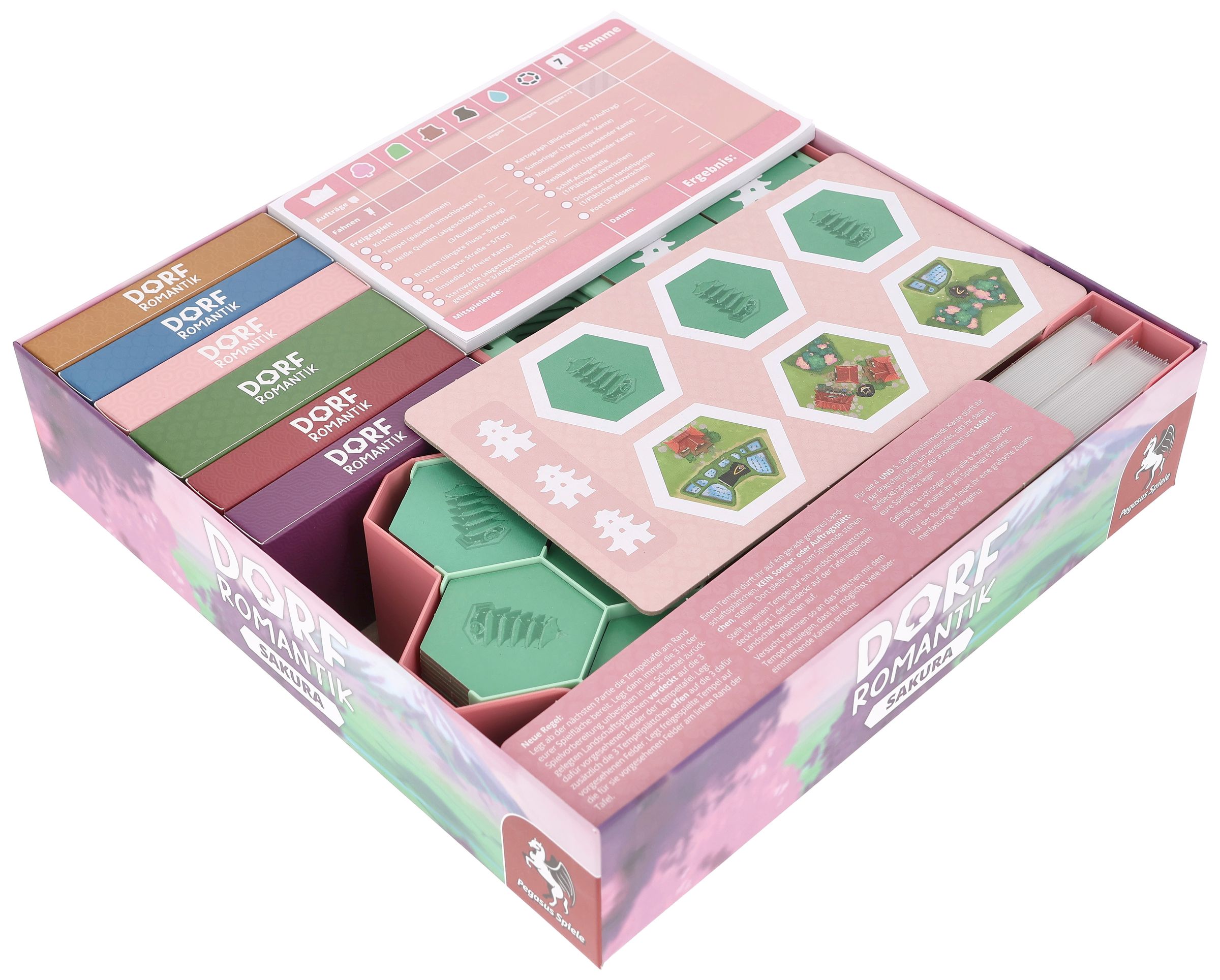 Con Dorfromantik: Sakura, las cosas se ponen floridas en la mesa de juego. Nuevas fichas, tareas adicionales y contenido secreto traen un soplo de aire fresco a tu mundo de Dorfromantik. Para ayudarte a tenerlo todo controlado mientras construyes, nuestro organizador Feldherr pone orden en la caja y en la mesa, para que juegues sin problemas y te diviertas más.