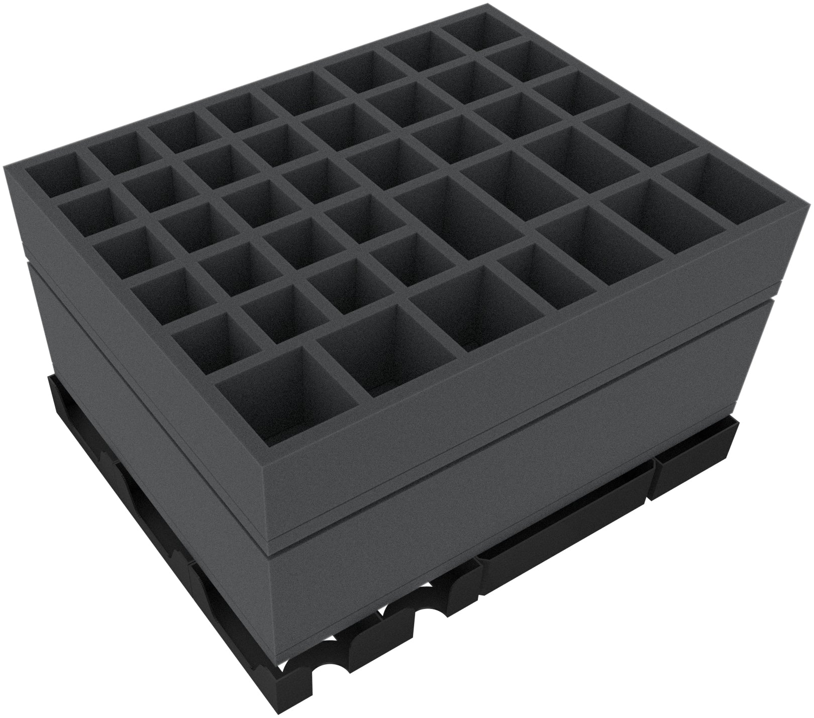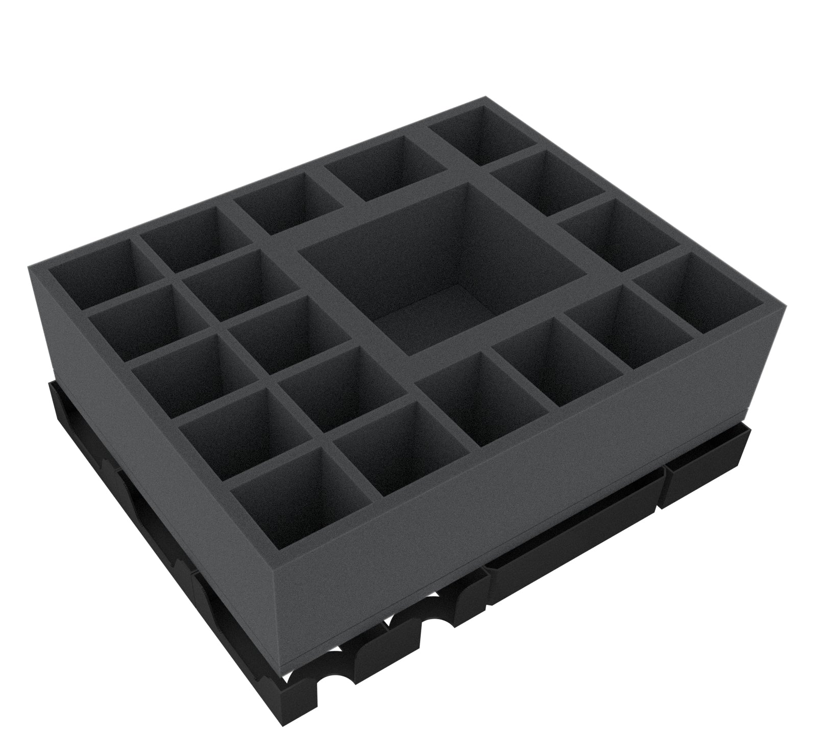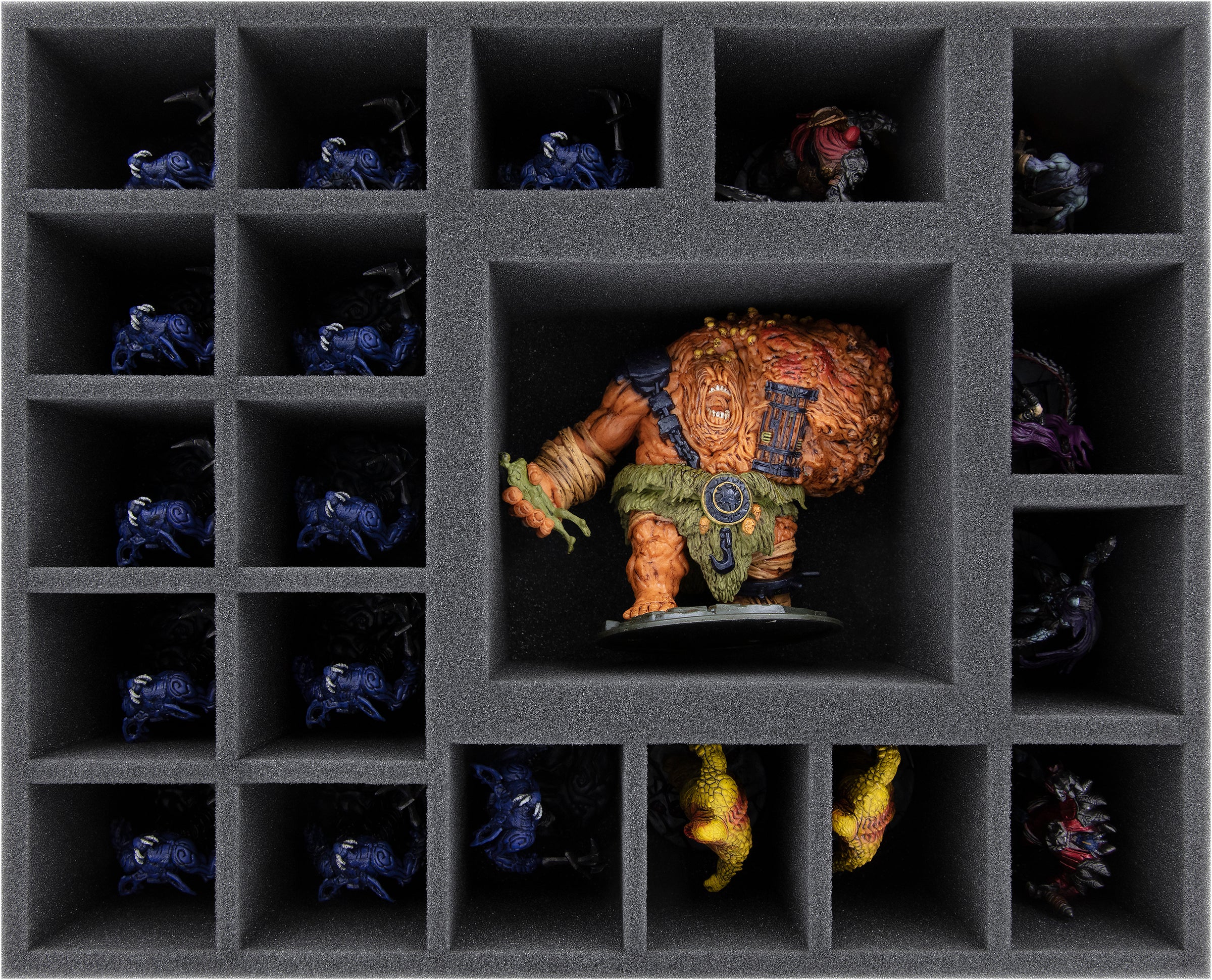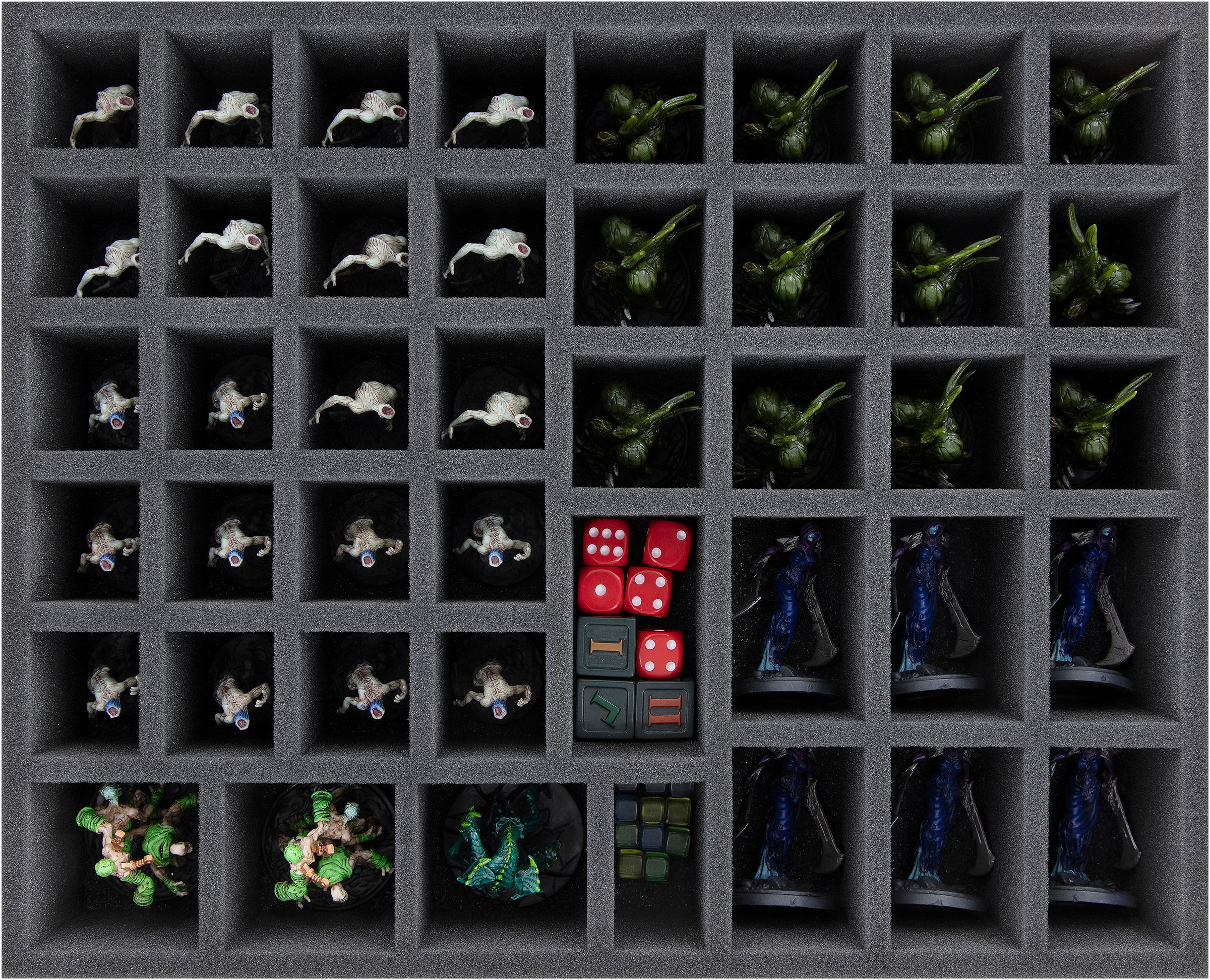 - 1 foam tray with 43 compartments for small and regular sized miniatures + game materials like dice and tokens.