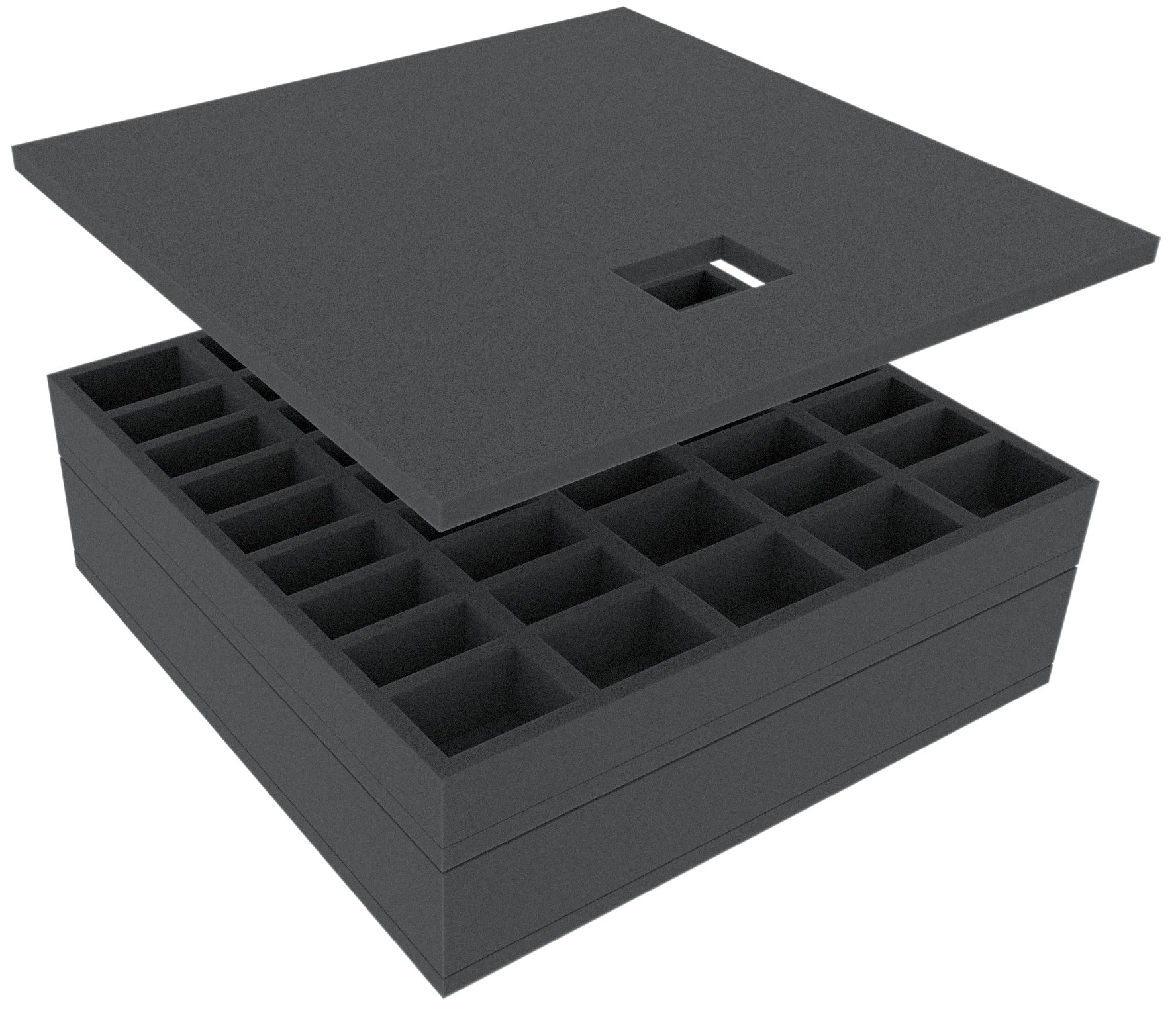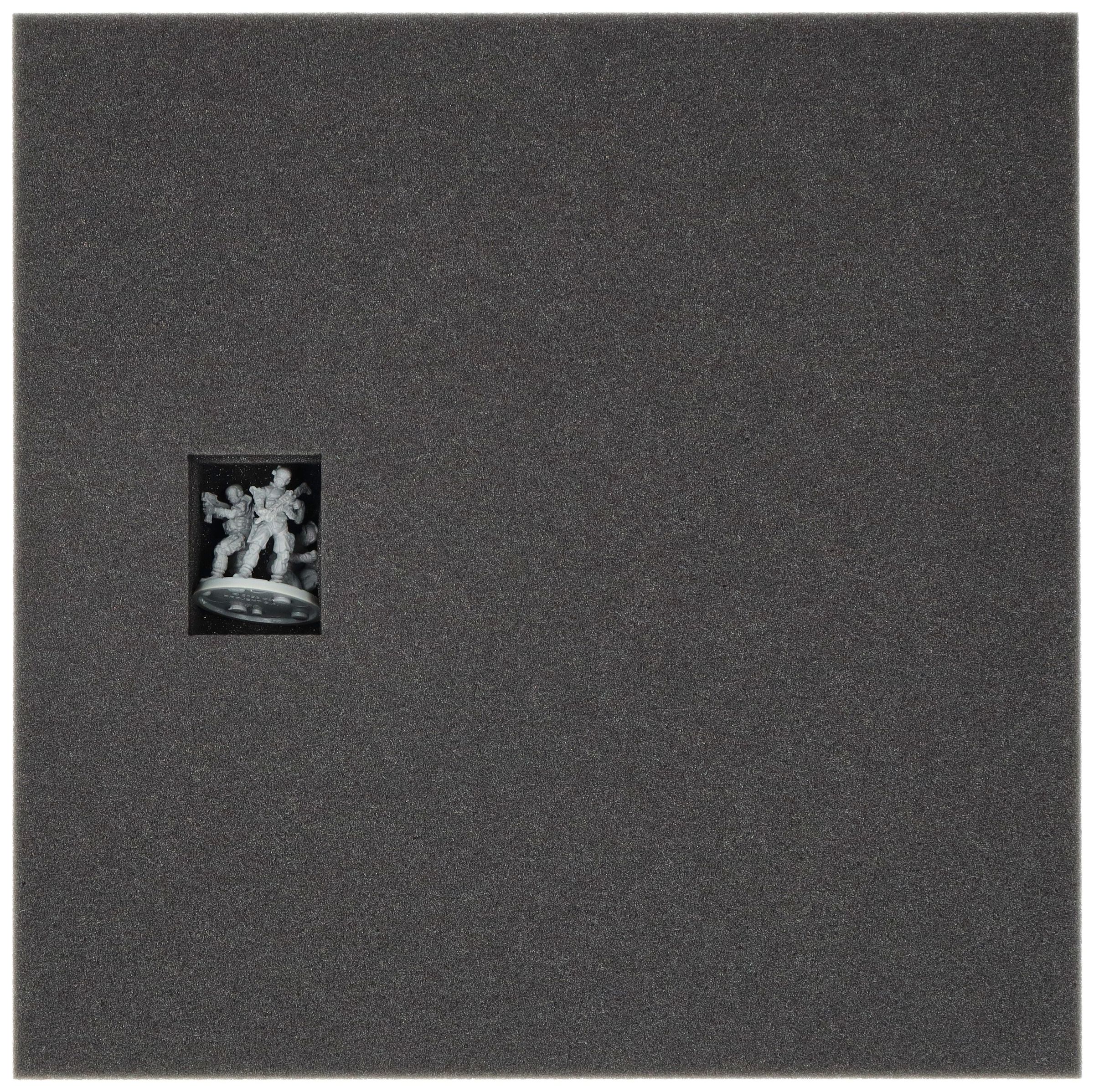 The two foam trays provide a secure hideout for your miniatures. Each miniature has its own custom-fit cut compartment. Since one miniature protrudes, the set includes an additional foam topper with a corresponding cutout. Place this on the lower insert.