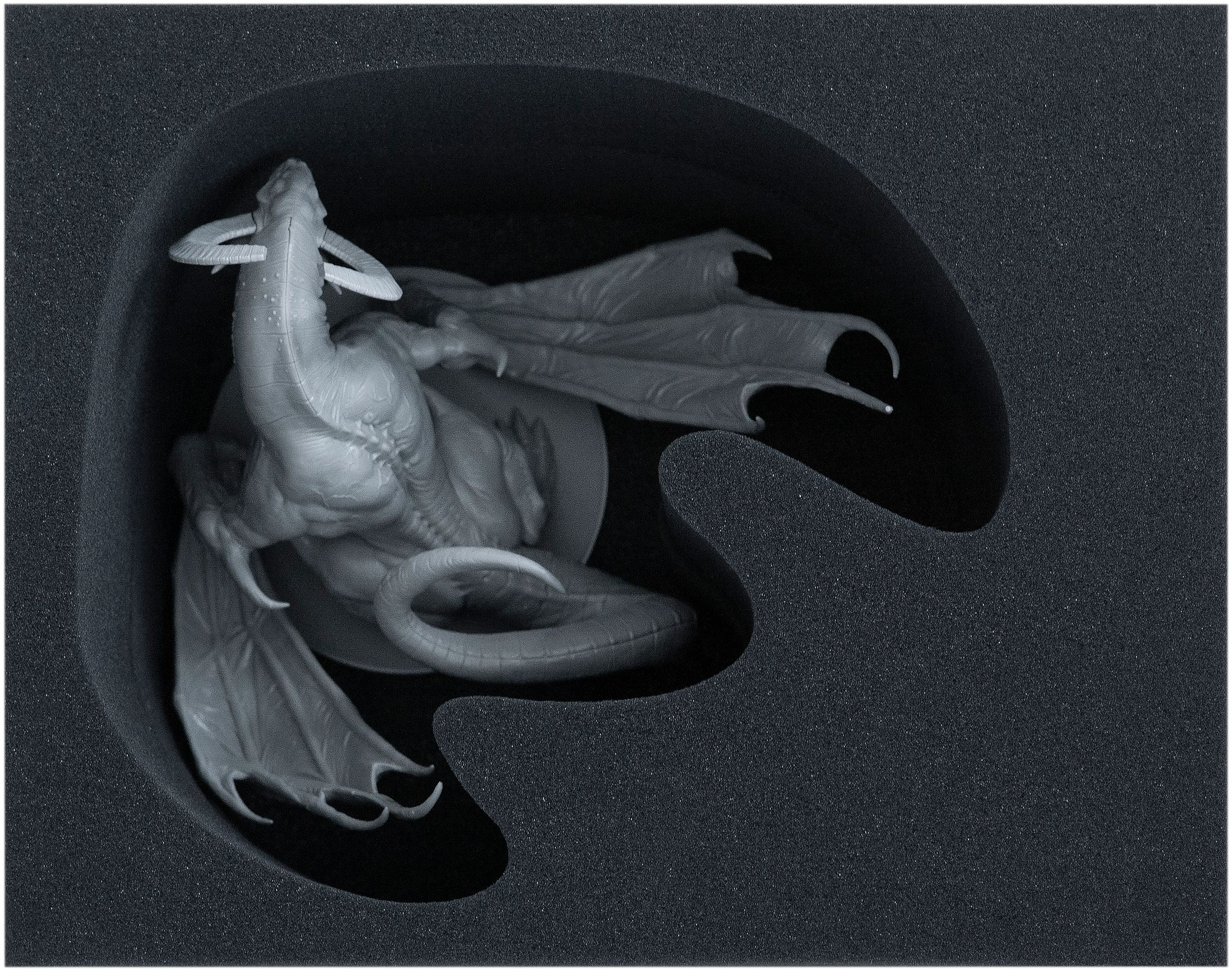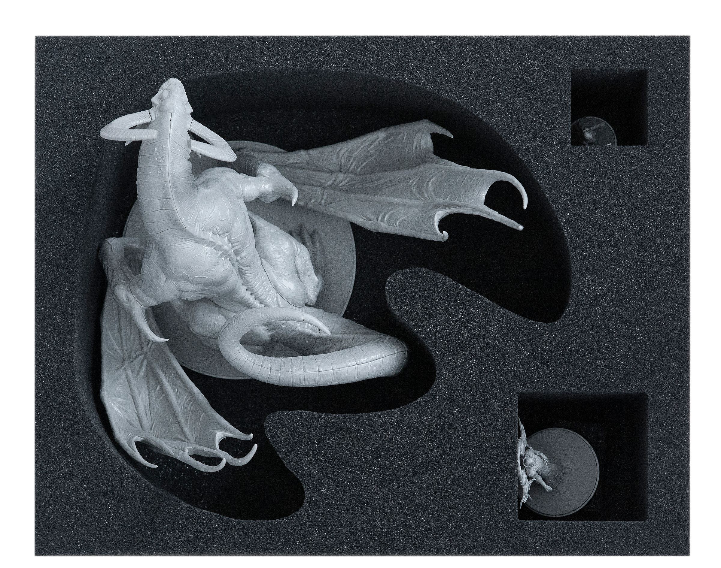 El set, que ofrece un espacio seguro para la exclusiva miniatura, consta de dos bandejas de espuma apilables y una cubierta de espuma. La bandeja inferior cuenta con un compartimento de corte personalizado para el Dragon King y dos compartimentos adicionales para miniaturas KDM 1.5 + 1.6 + 1.6 más pequeñas, como por ejemplo Flower Knight. Esta bandeja viene con una base de 10 mm.