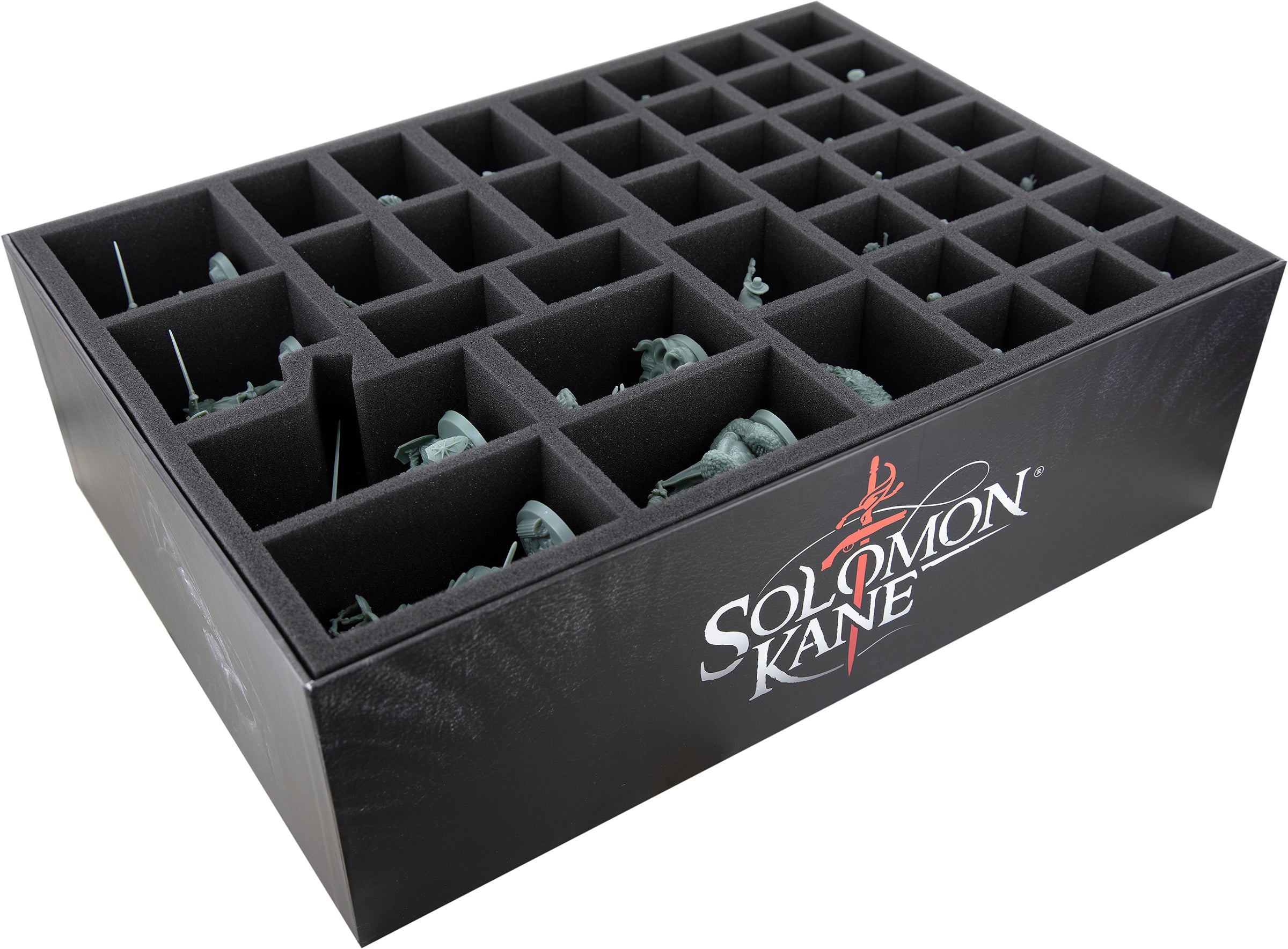 In the two 65 mm high inserts, a total of 80 compartments are available for your miniatures. The inserts provide a suitable compartment for every miniature, whether it is the titular Solomon Kane, the giant L'Ogre or one of the other fantastic figures.