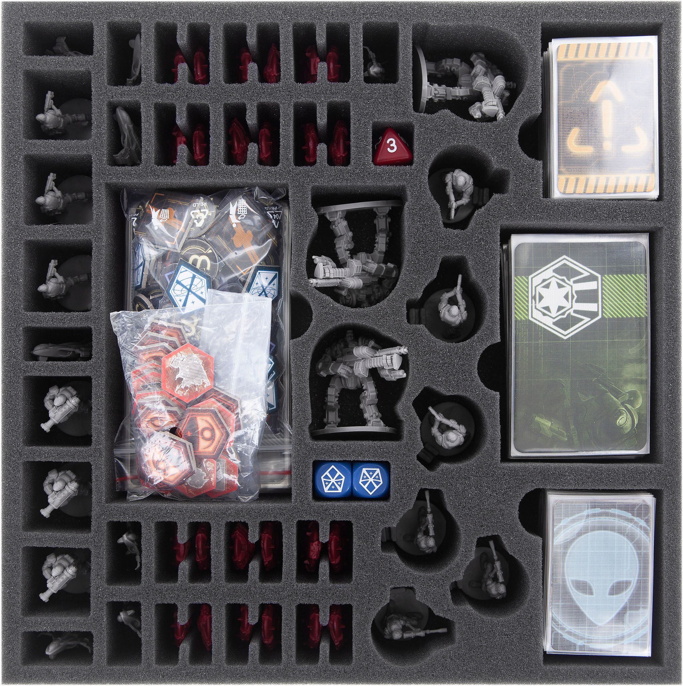 Hereby, miniatures and game accessories are neatly and securely stowed away. Everything is quickly at hand, you save time and nerves when setting up the game and you have more time for defending our planet.