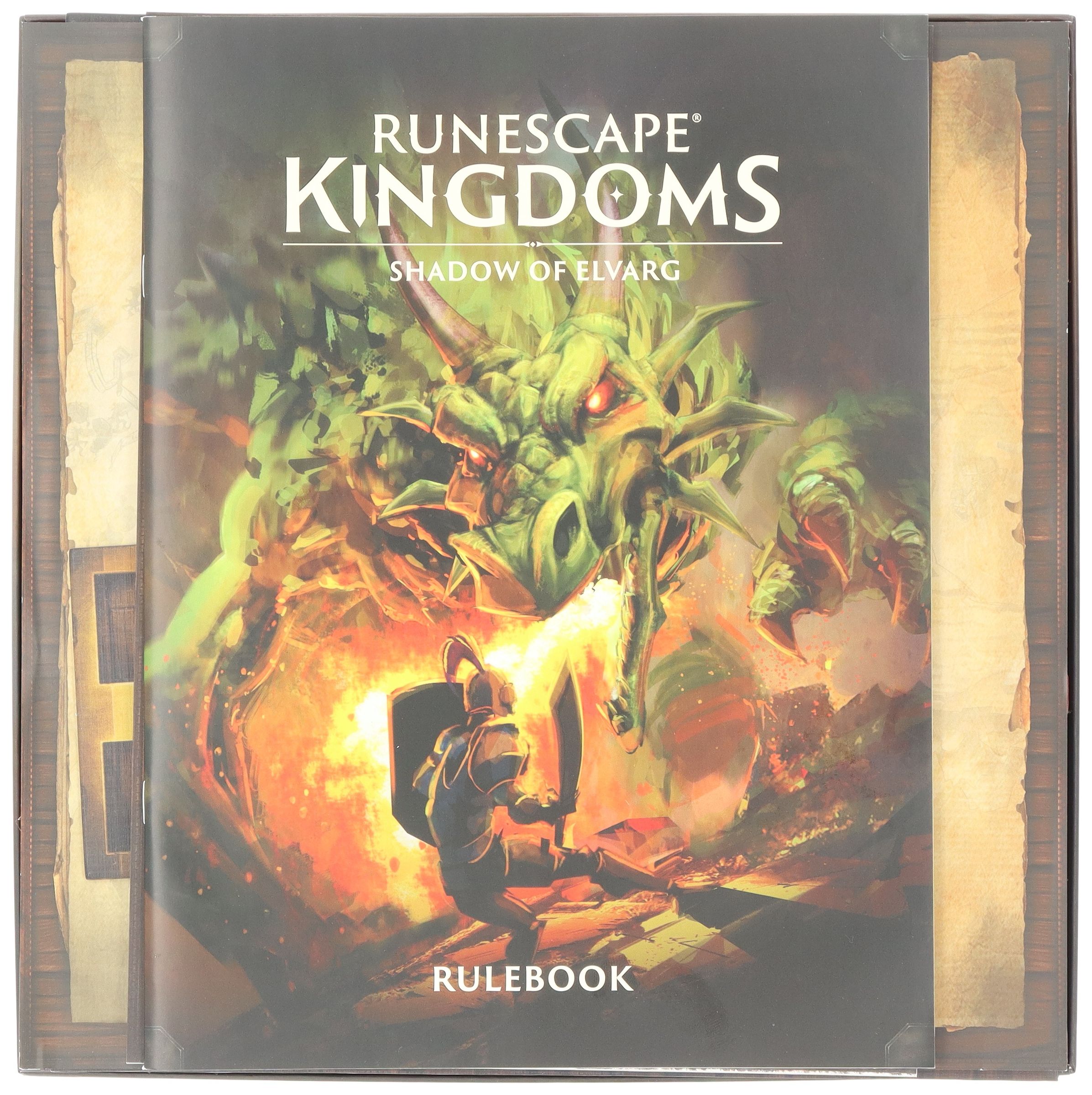• The set fits precisely into the original core game box of Runescape Kingdoms: Shadow of Elvarg (Set dimensions: 285 x 285 x 95 mm).