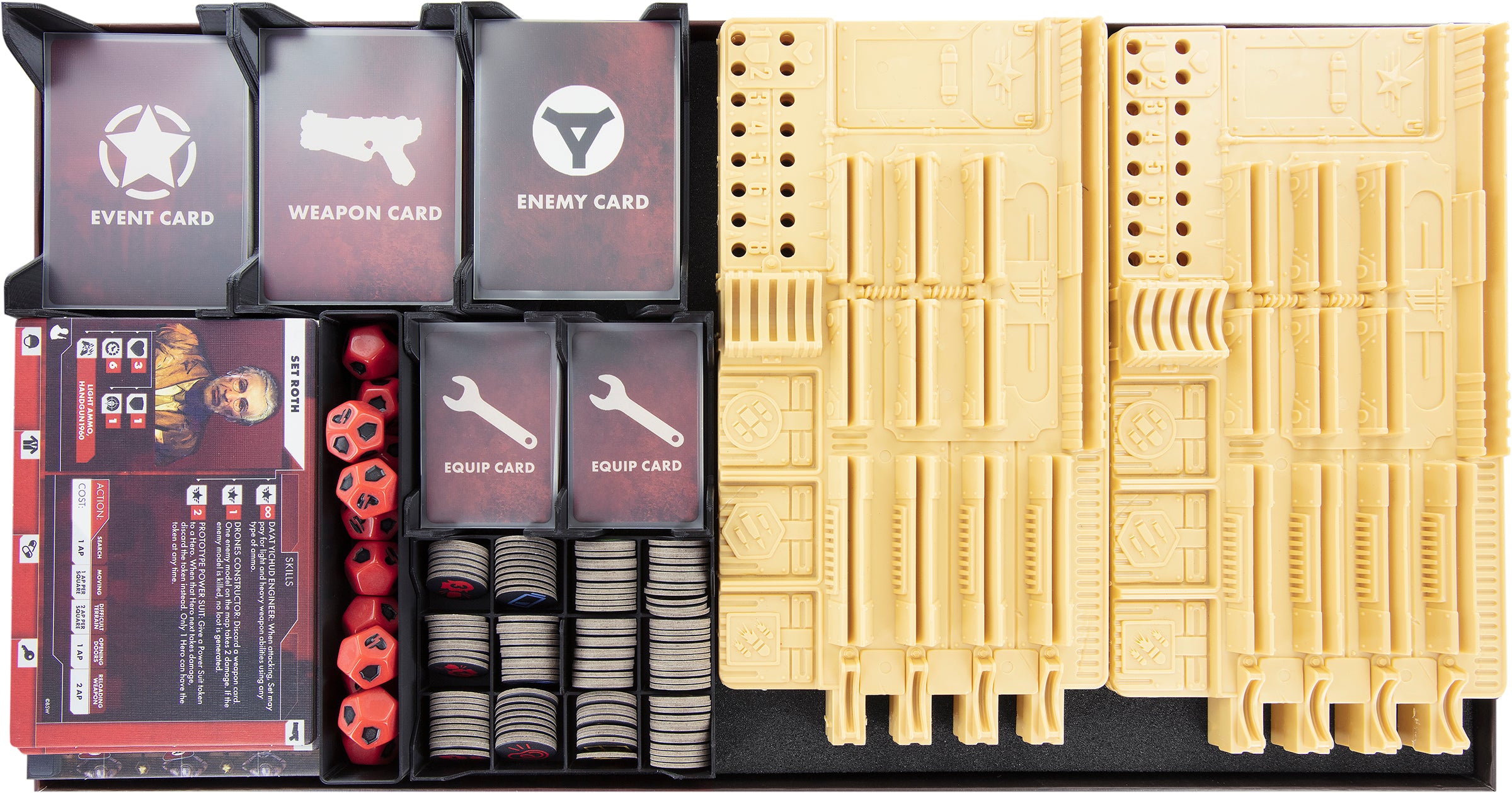 • 3 plastic card holders, each with a compartment for standard cards like enemy cards, event cards, weapon cards