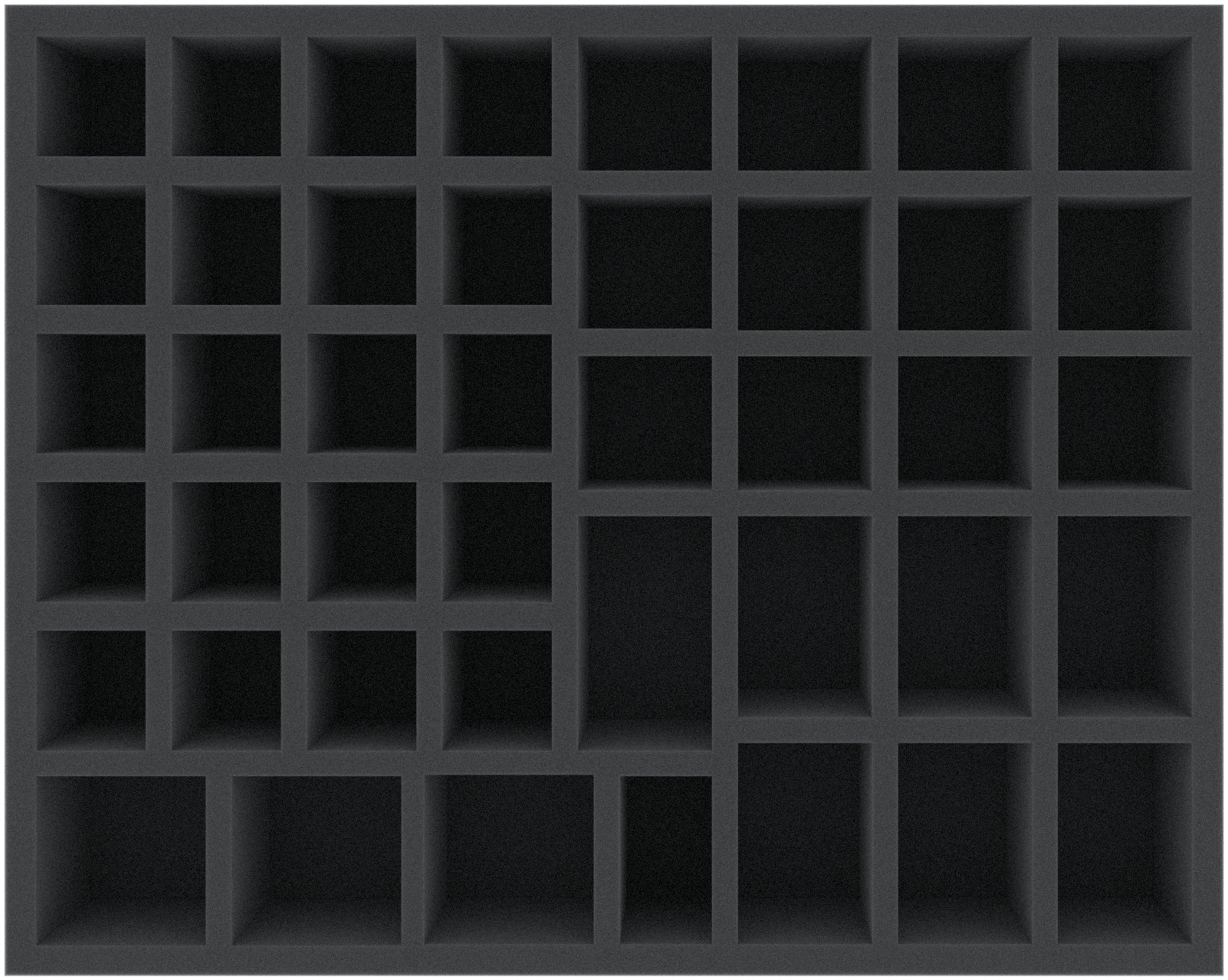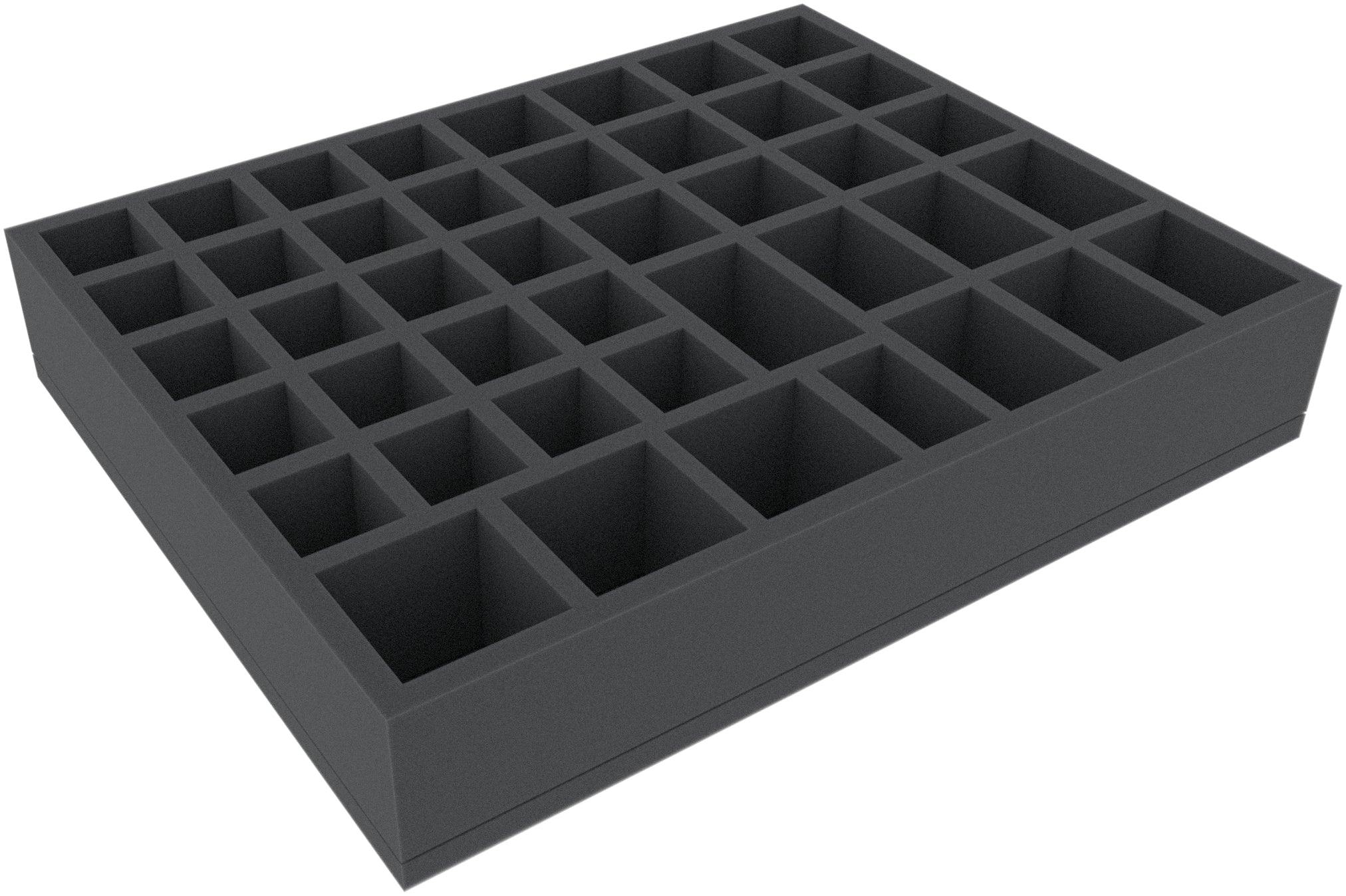 Esta bandeja de espuma de 60 mm de altura está dividida en 43 compartimentos. Es especialmente adecuada para guardar de forma segura miniaturas de juegos de mesa y de tablero, así como otros modelos frágiles y piezas pequeñas.