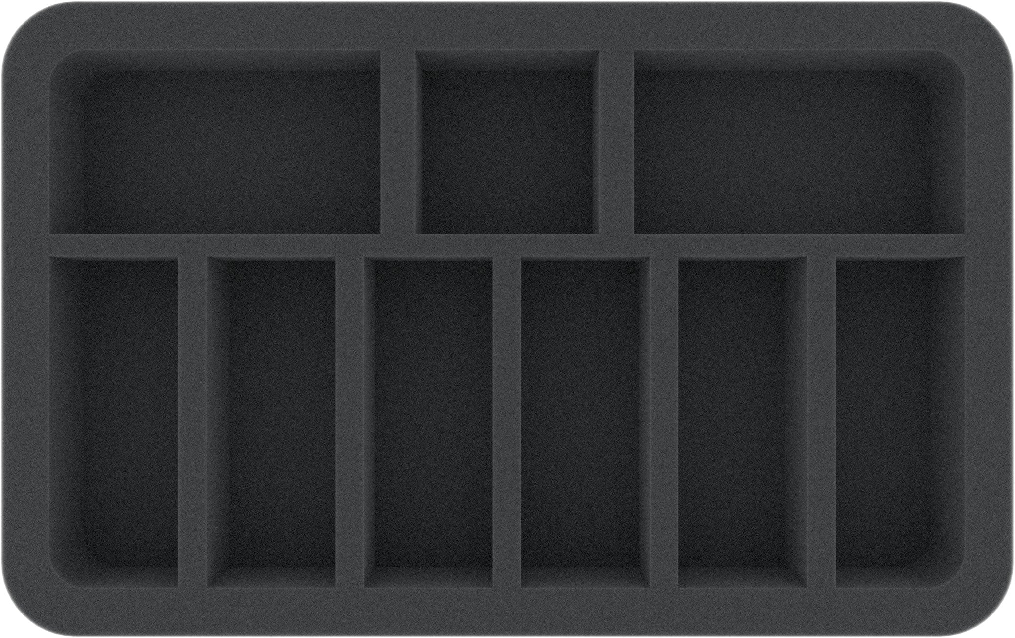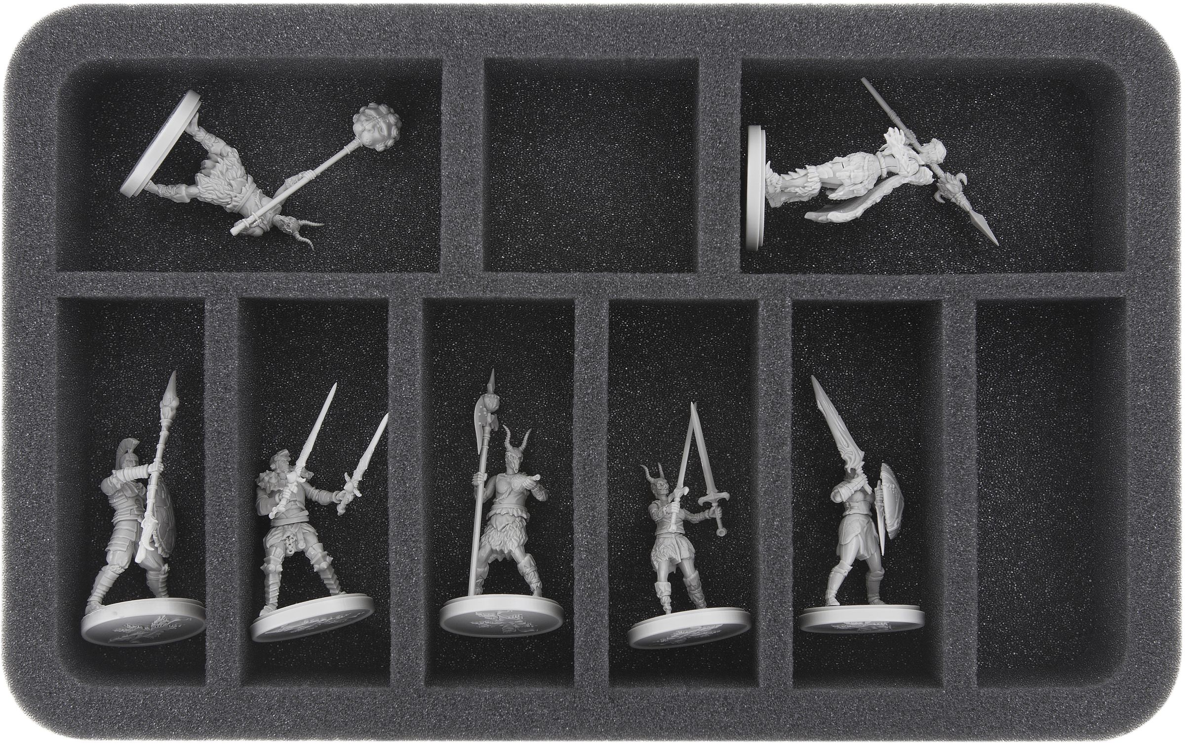 Este Half-Size está dividido en 9 compartimentos de diferentes tamaños. Es ideal para miniaturas alargadas de sobremesa y de juegos de mesa (como guerreros con mosquete, espada o lanza) con bases de hasta 30 mm.