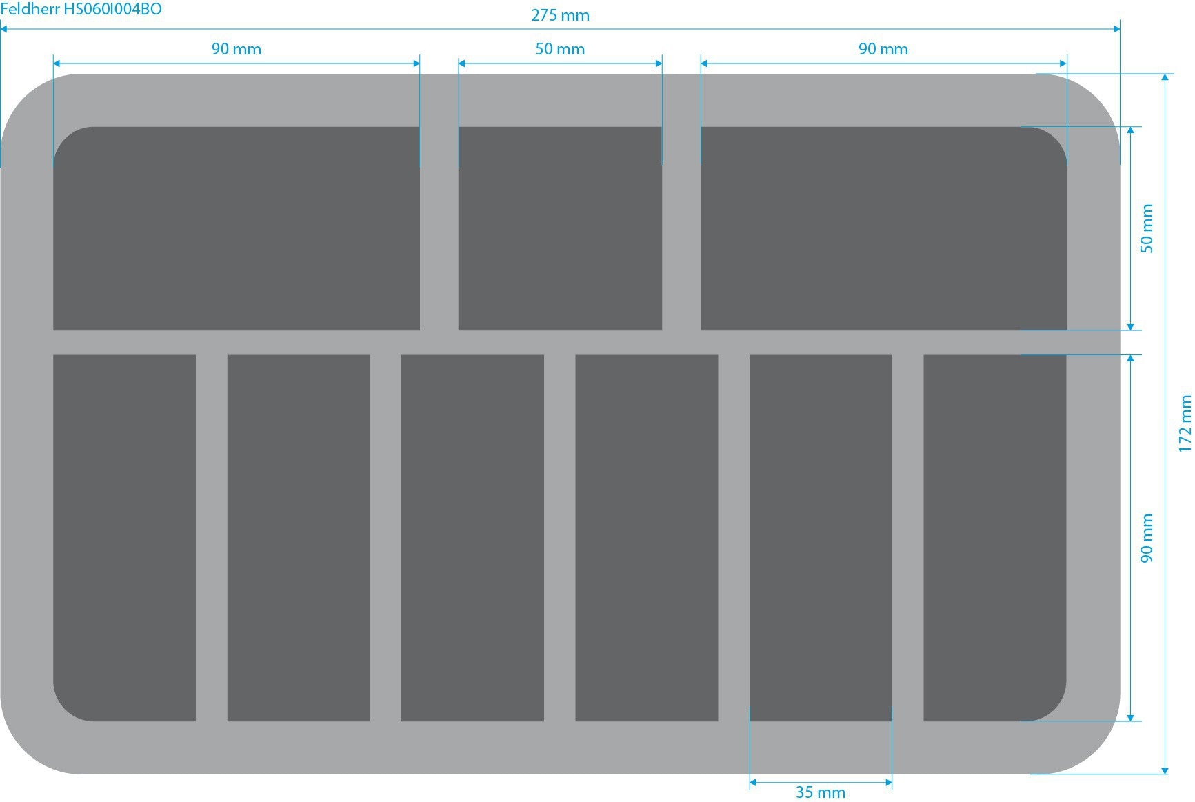 • 6 compartimentos: 90 mm de largo x 35 mm de ancho x 30 mm de profundidad