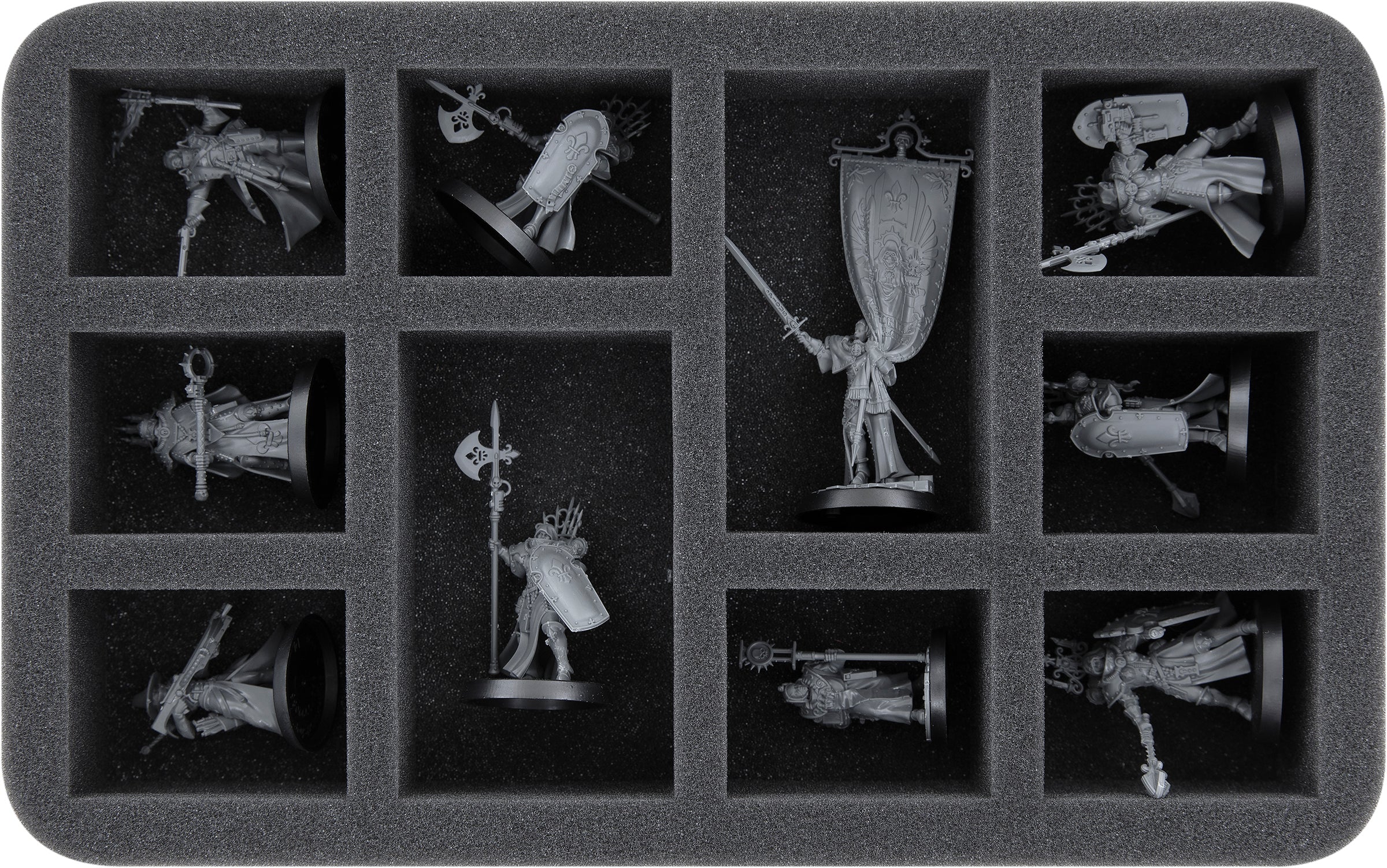 Hasta 10 modelos pueden ser protegidos en esta bandeja de espuma Half-Size. Los 10 compartimentos en dos tamaños diferentes son ideales para las unidades estándar de la Adepta Sororitas y para las unidades con detalles de pancartas y tallas.
