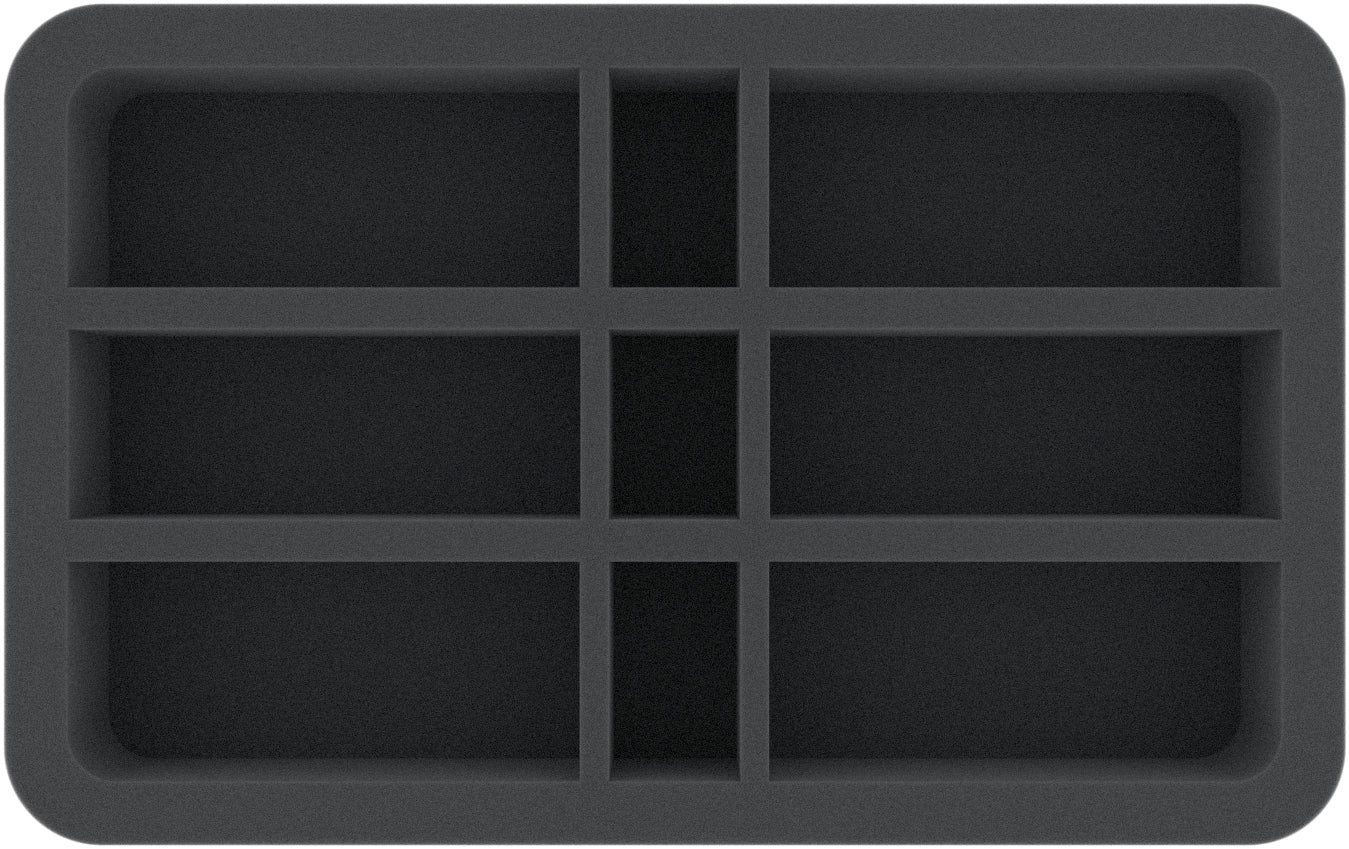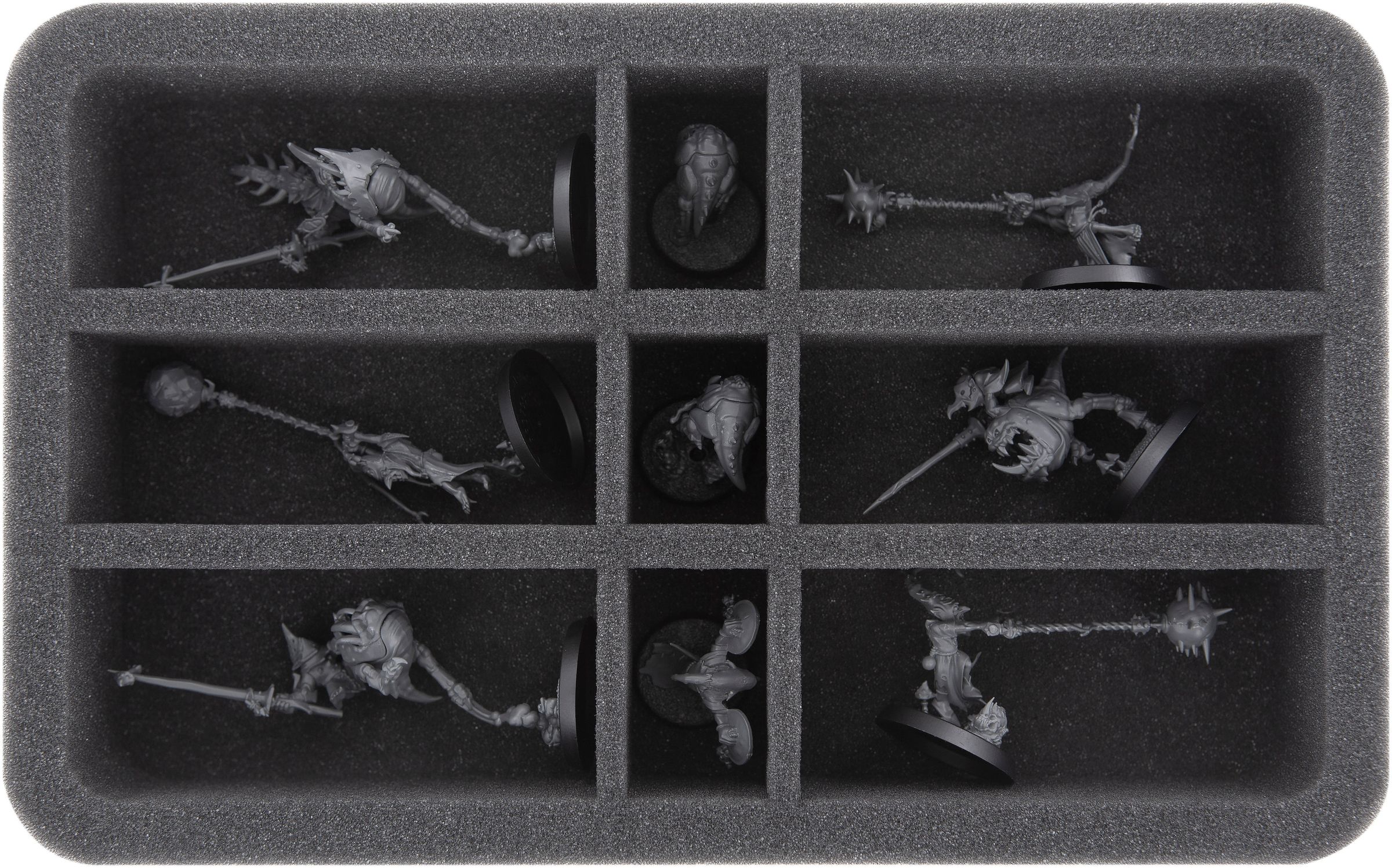 Esta pieza de espuma Half-Size está dividida en 9 compartimentos con 3 tamaños diferentes. Es ideal para guardar de forma clara y segura los modelos alargados de la Gloomspite Gitz.