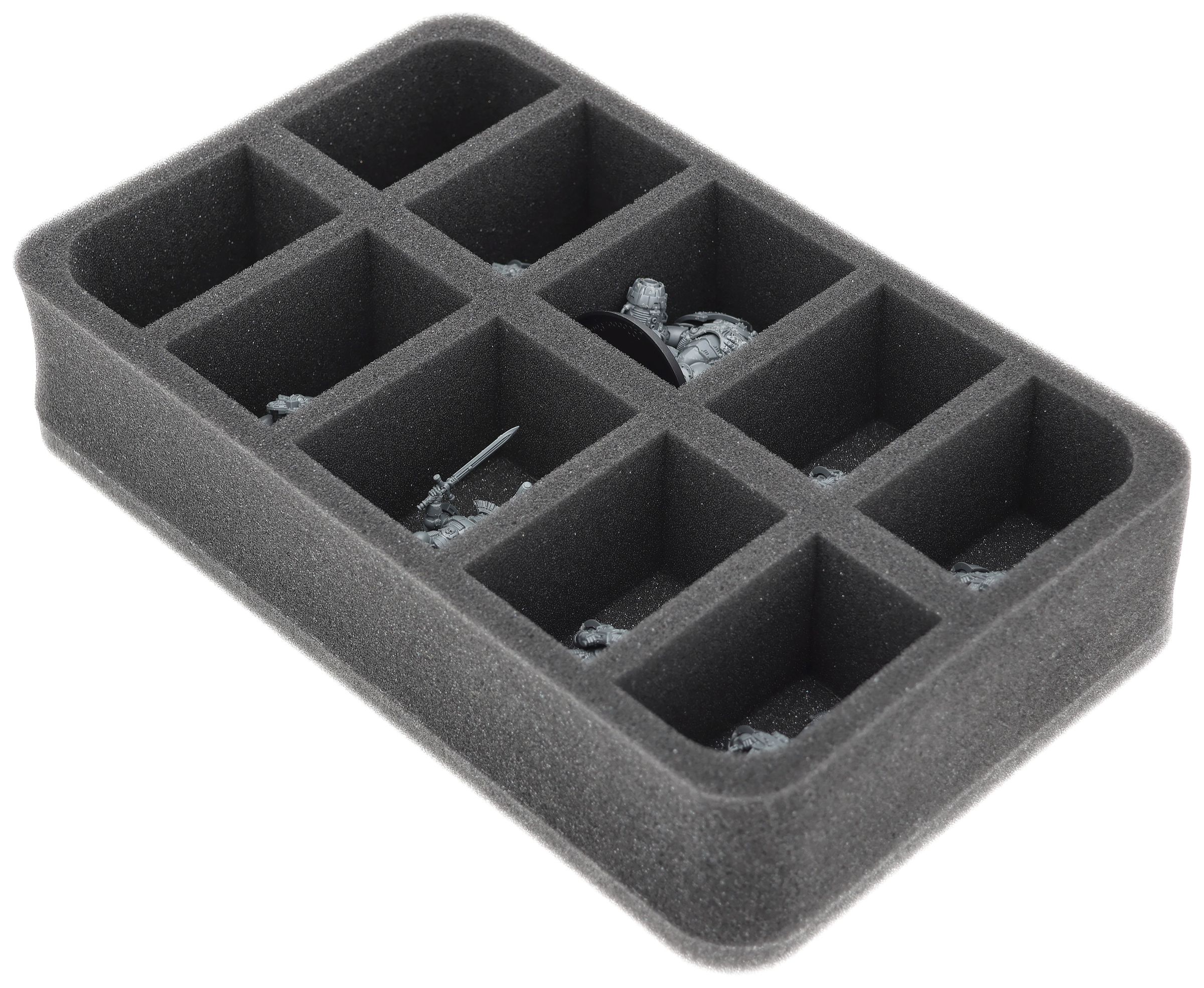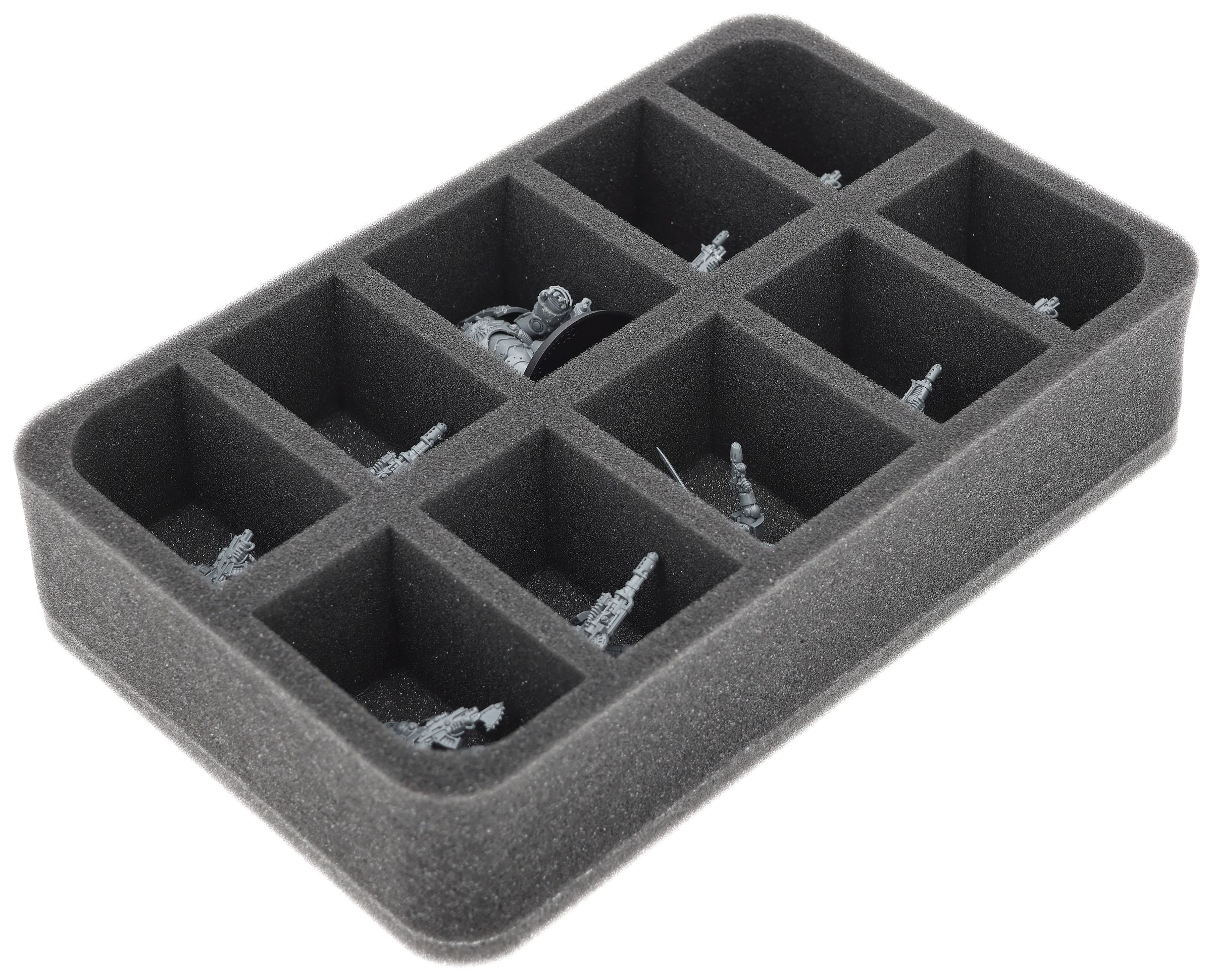 En esta bandeja de espuma Feldherr tienes espacio para hasta 10 miniaturas de tu ejército. El inserto es especialmente adecuado para guardar la escuadra Terminator Saturnine y modelos de tamaño similar.