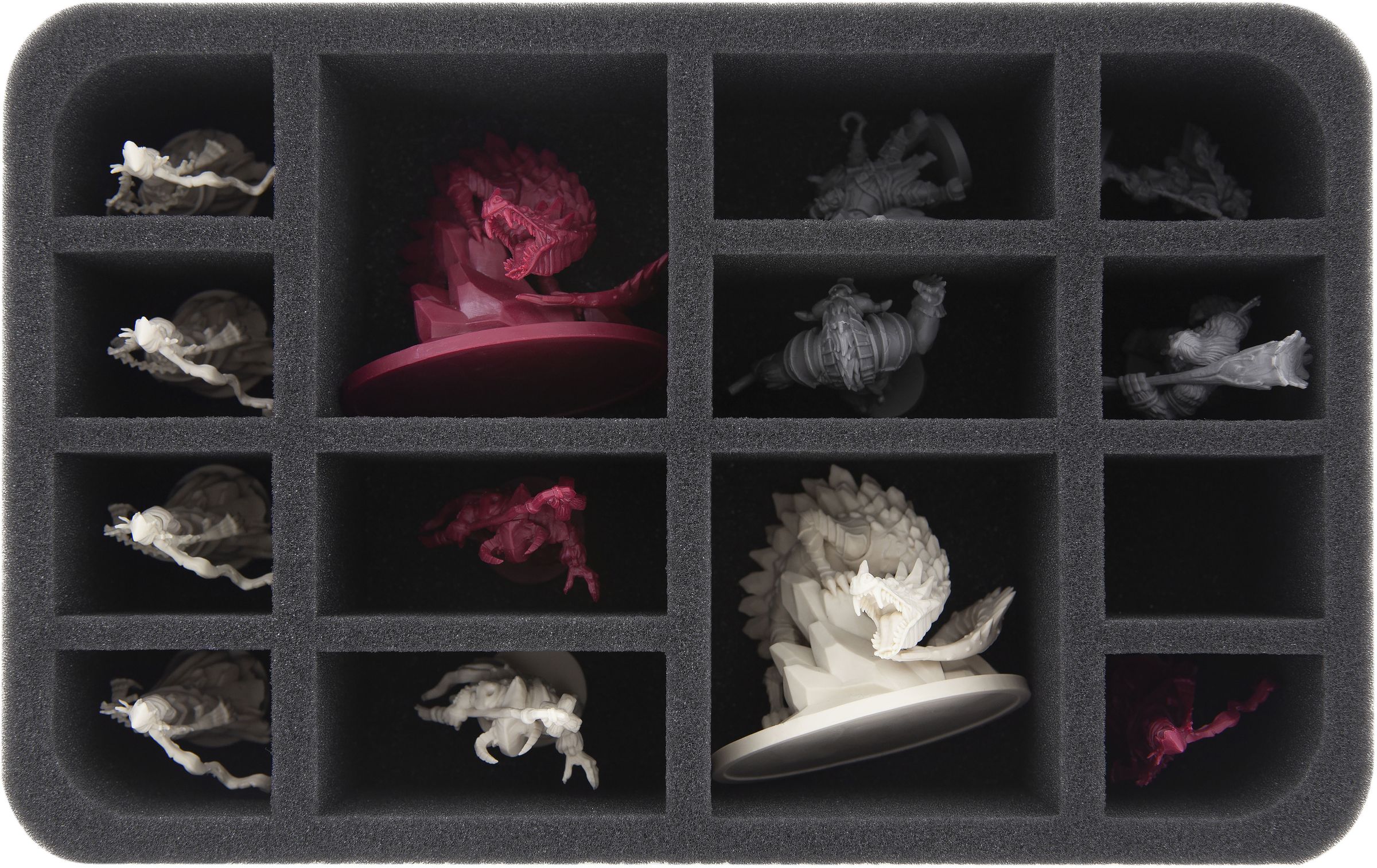 La bandeja de espuma proporciona un refugio seguro para todas las miniaturas de la expansión. Los dos altos Wyrms de hielo se quedarán con los compartimentos grandes. Los dos minotauros oscuros, así como los héroes Un puño y Cuernos de acero encajan en los de tamaño mediano. Las cinco Sombras y los héroes Karnon y Arvel Worldwalker se distribuyen en los compartimentos más pequeños. El corte preciso en miniatura evita que las figuras se deslicen y choquen durante el transporte. Esto protegerá las figuras pintadas de la abrasión. Los detalles delicados, como las garras y la tela de los Shades, también permanecen intactos.