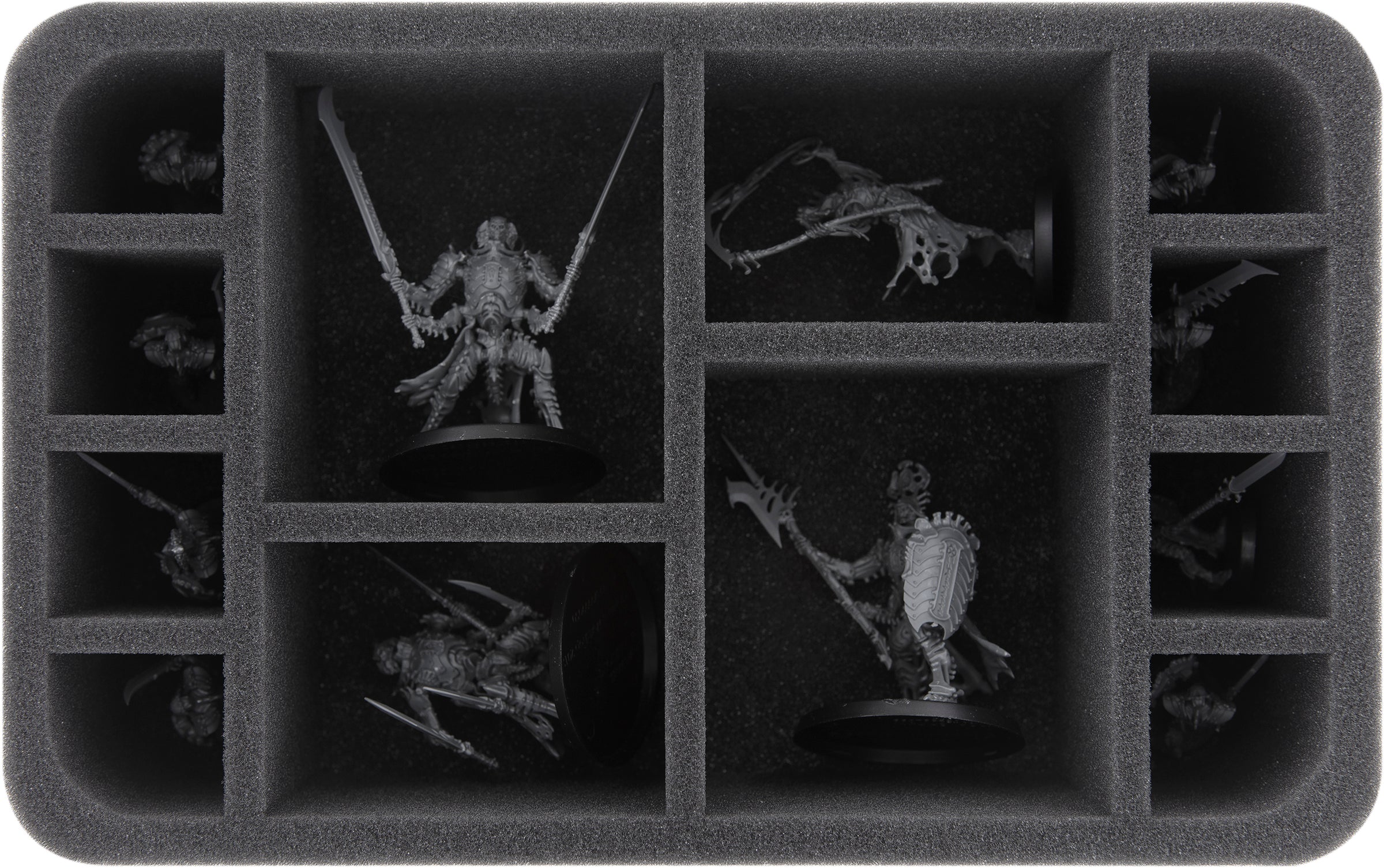The 12 compartments on this Half-Size foam tray are divided into three different sizes. The insert is suitable for larger models of your undead army as well as for small infantry miniatures.