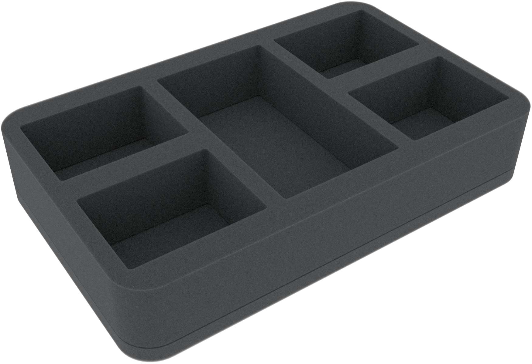 This Half-Size foam tray has 5 compartments of different sizes. It is particularly suitable for the clear storage of game material such as cards, tiles or tokens.
